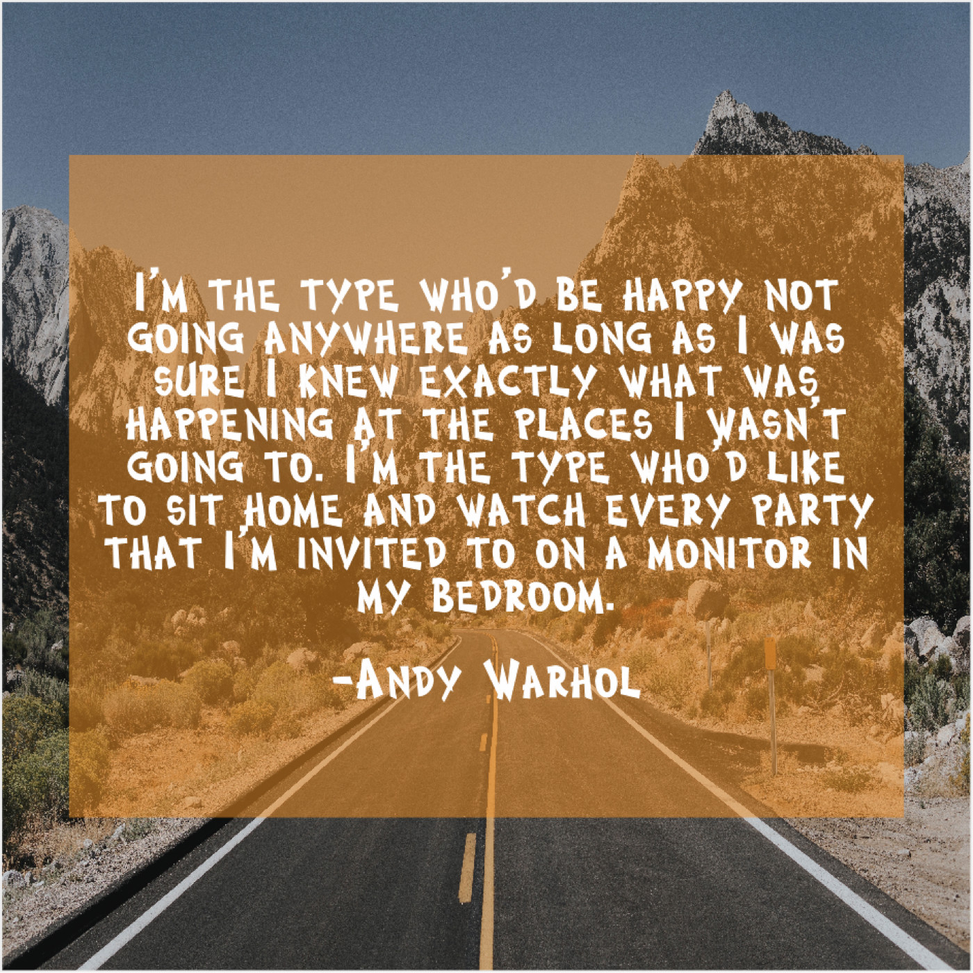 “I’m the type who’d be happy not going anywhere as long as I was sure I knew exactly what was happening at the places I wasn’t going to. I’m the type who’d like to sit home and watch every party that I’m invited to on a monitor in my bedroom.”
