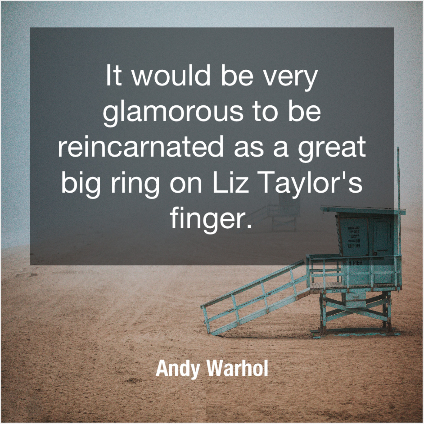 Andy Warhol Andy Warhol – It would be very glamorous… August 9, 2019 admin “It would be very glamorous to be reincarnated as a great big ring on Liz Taylor’s finger.”-Andy Warhol
