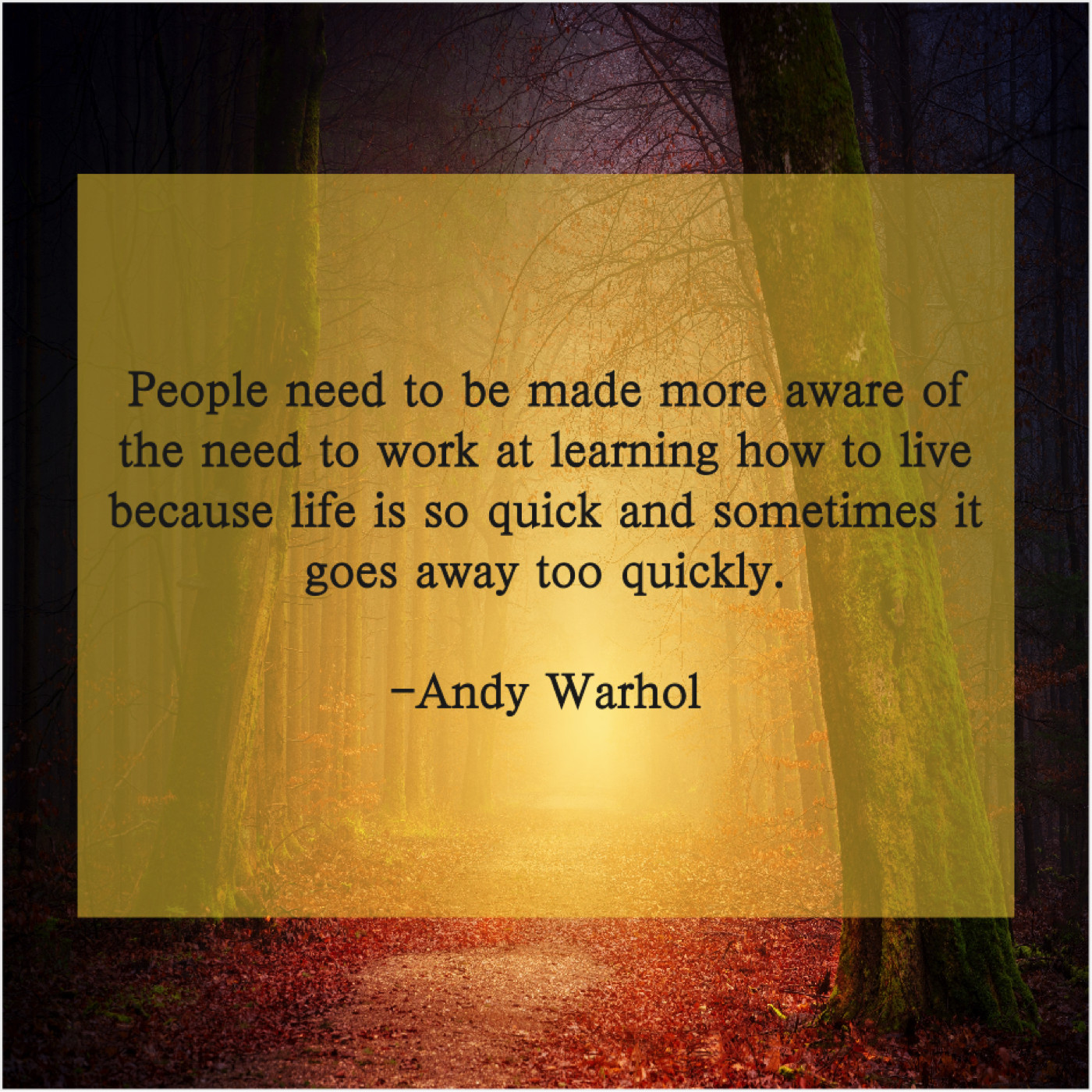 Andy Warhol Andy Warhol – People need to be made… July 3, 2019 admin “People need to be made more aware of the need to work at learning how to live because life is so quick and sometimes it goes away too quickly.”-Andy Warhol