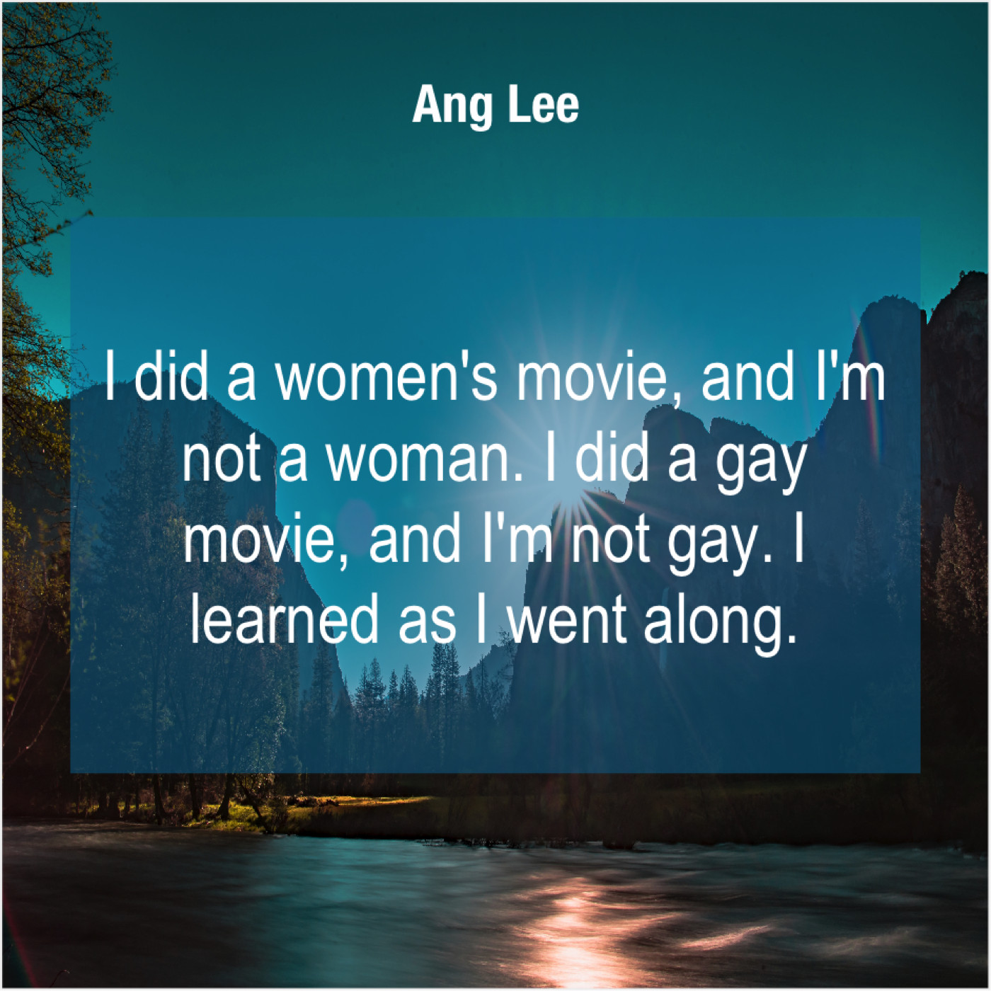 Ang Lee Ang Lee – I did a women’s movie… April 18, 2019 admin “I did a women’s movie, and I’m not a woman. I did a gay movie, and I’m not gay. I learned as I went along.”-Ang Lee