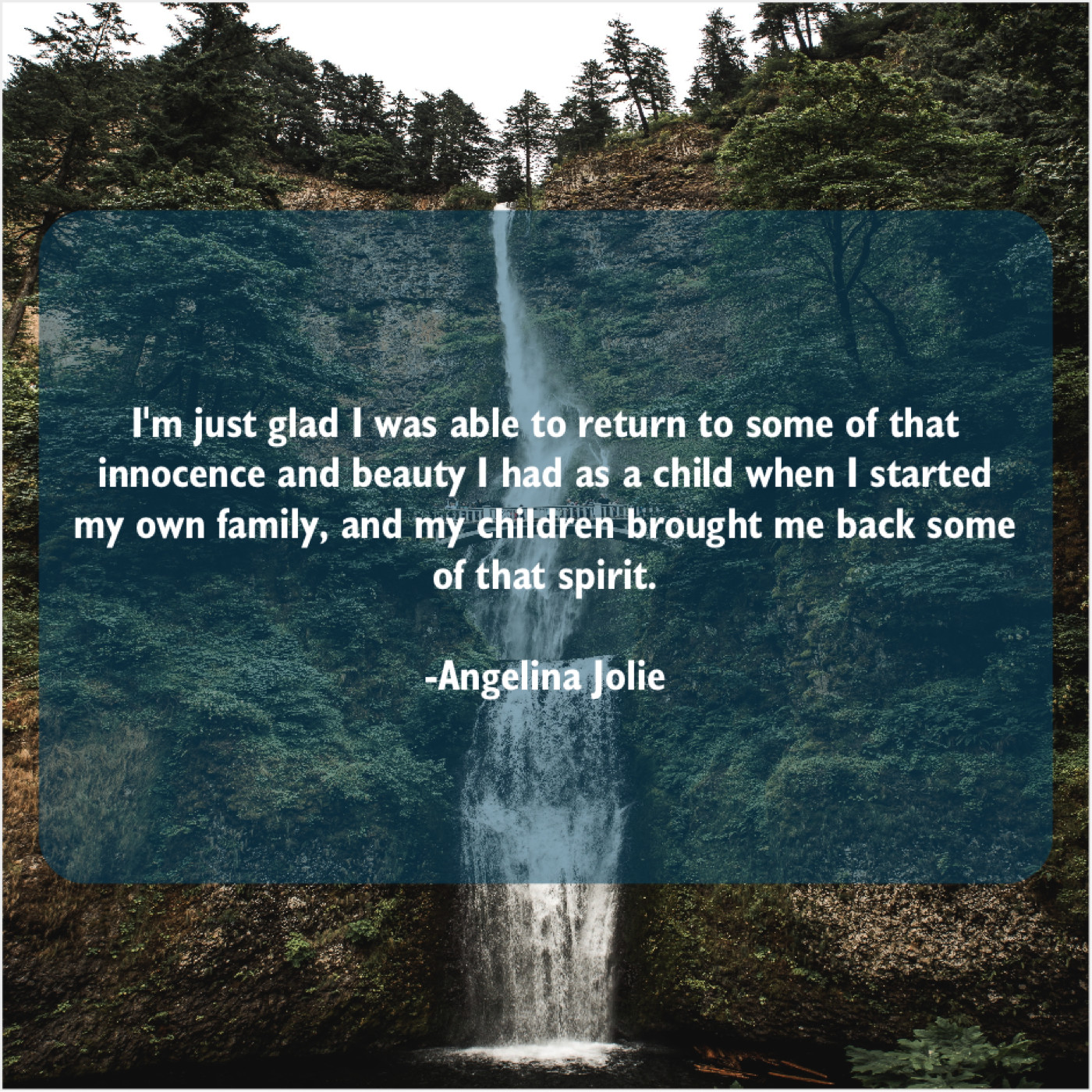 Angelina Jolie Angelina Jolie – I’m just glad I was… May 27, 2019 admin “I’m just glad I was able to return to some of that innocence and beauty I had as a child when I started my own family, and my children brought me back some of that spirit.”-Angelina Jolie