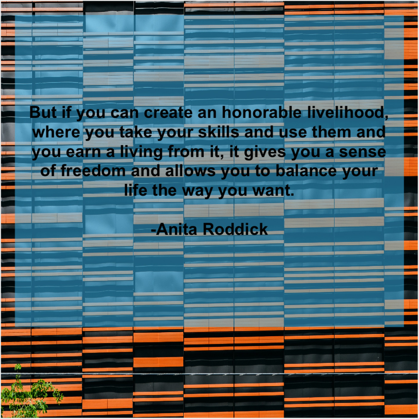 Anita Roddick Anita Roddick – But if you can create… August 4, 2019 admin “But if you can create an honorable livelihood, where you take your skills and use them and you earn a living from it, it gives you a sense of freedom and allows you to balance your life the way you want.”-Anita Roddick