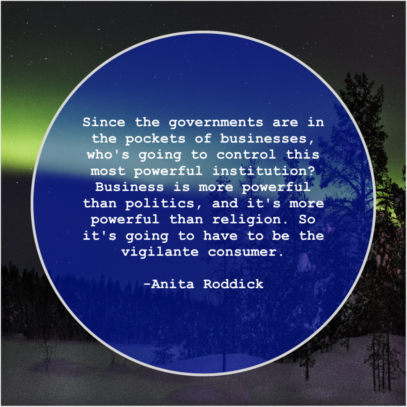 “Since the governments are in the pockets of businesses, who’s going to control this most powerful institution? Business is more powerful than politics, and it’s more powerful than religion. So it’s going to have to be the vigilante consumer.”