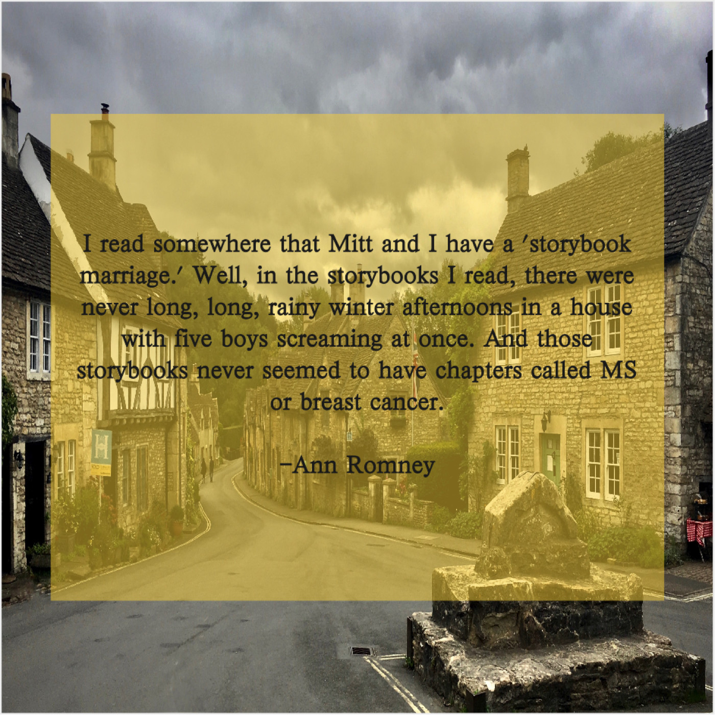 “I read somewhere that Mitt and I have a ‘storybook marriage.’ Well, in the storybooks I read, there were never long, long, rainy winter afternoons in a house with five boys screaming at once. And those storybooks never seemed to have chapters called MS or breast cancer.”