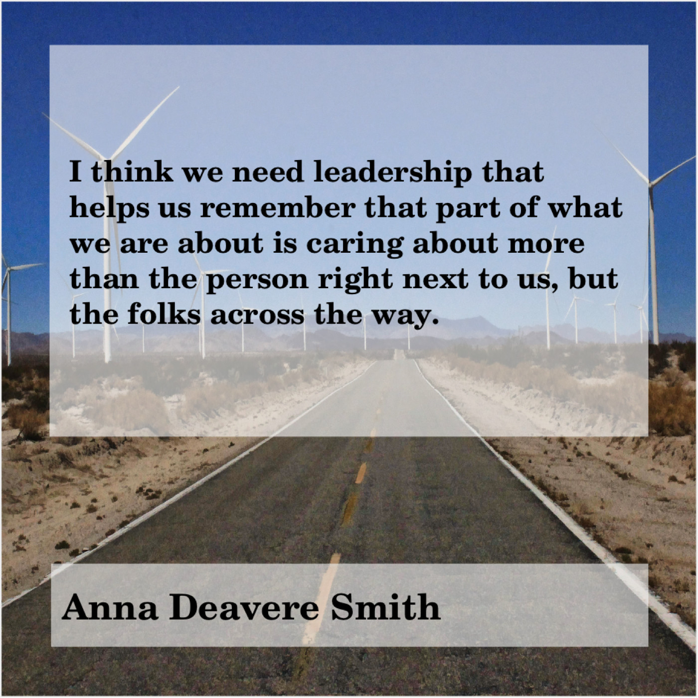 Anna Deavere Smith Anna Deavere Smith – I think we need leadership… May 4, 2019 admin “I think we need leadership that helps us remember that part of what we are about is caring about more than the person right next to us, but the folks across the way.”-Anna Deavere Smith