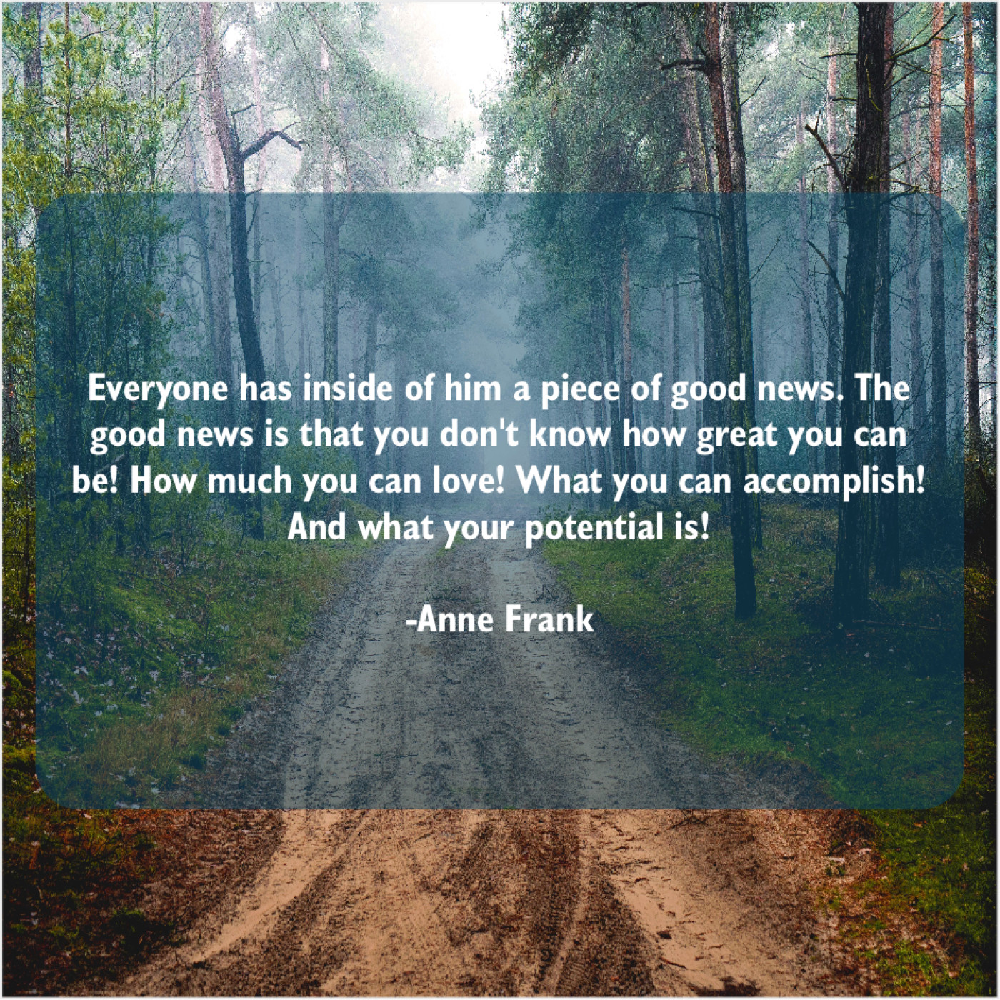 Anne Frank Anne Frank – Everyone has inside of him… October 1, 2019 admin “Everyone has inside of him a piece of good news. The good news is that you don’t know how great you can be! How much you can love! What you can accomplish! And what your potential is!”-Anne Frank