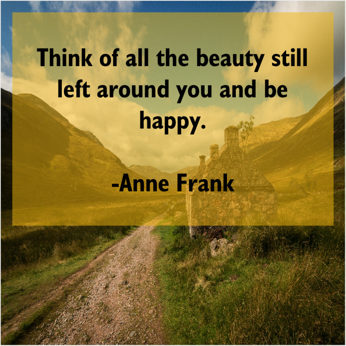 Anne Frank Anne Frank – Think of all the beauty… March 14, 2019 admin “Think of all the beauty still left around you and be happy.”-Anne Frank