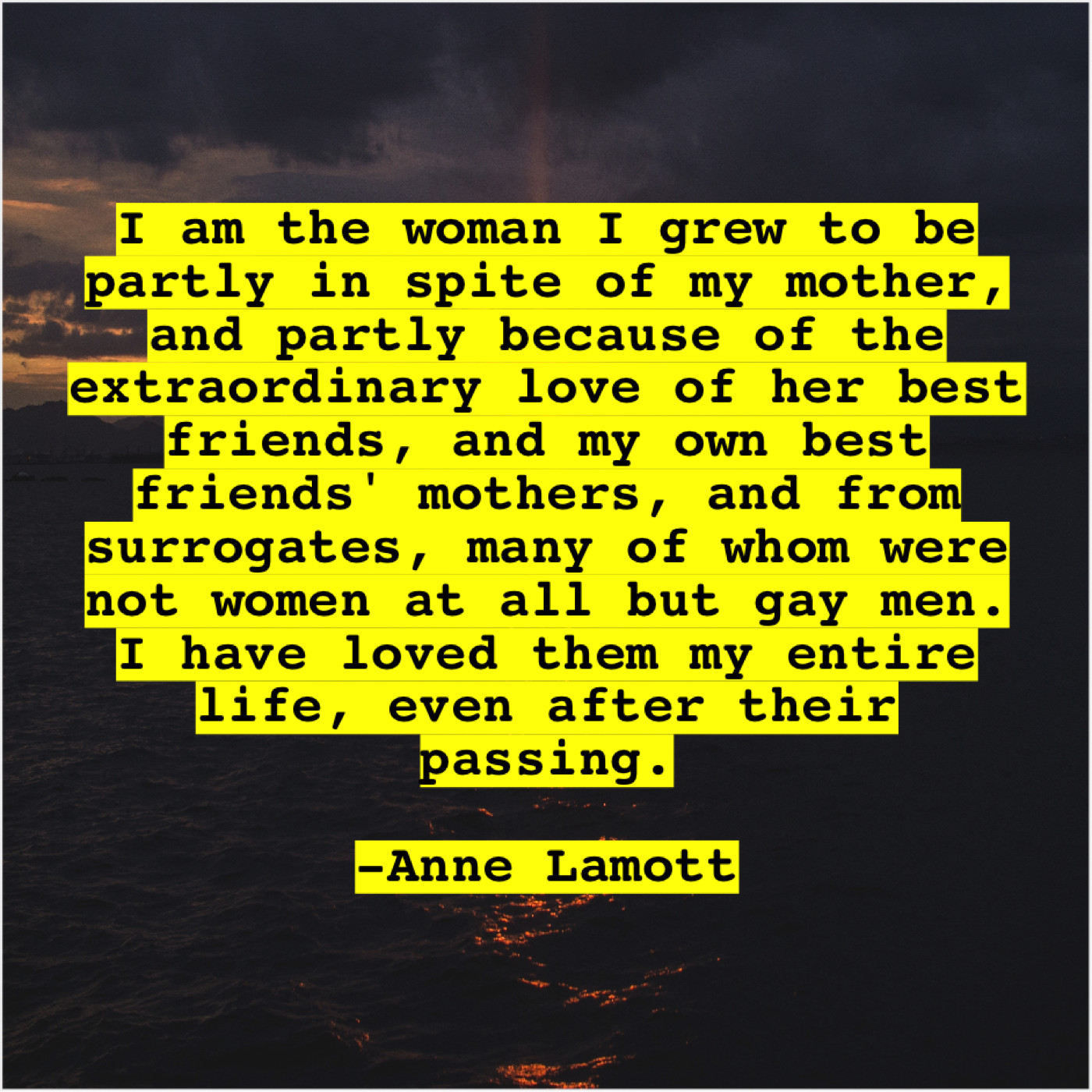 “I am the woman I grew to be partly in spite of my mother, and partly because of the extraordinary love of her best friends, and my own best friends’ mothers, and from surrogates, many of whom were not women at all but gay men. I have loved them my entire life, even after their passing.”