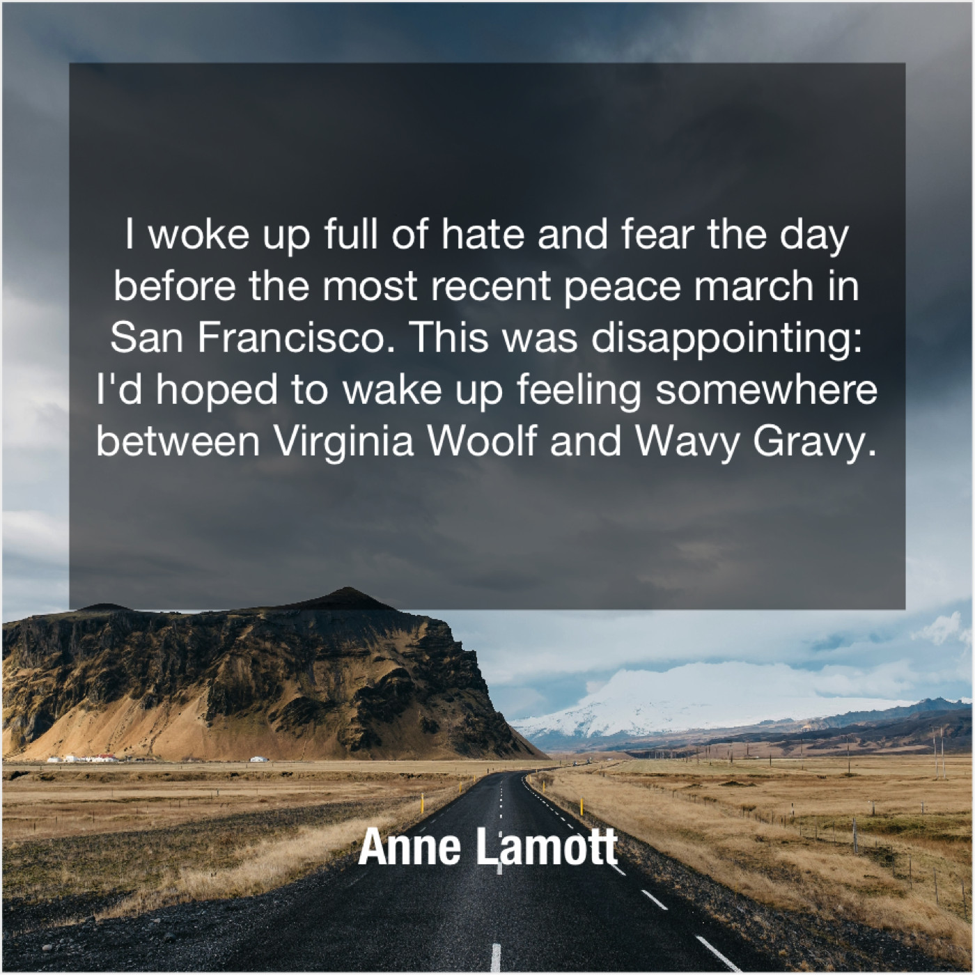 Anne Lamott Anne Lamott – I woke up full of… May 27, 2019 admin “I woke up full of hate and fear the day before the most recent peace march in San Francisco. This was disappointing: I’d hoped to wake up feeling somewhere between Virginia Woolf and Wavy Gravy.”-Anne Lamott
