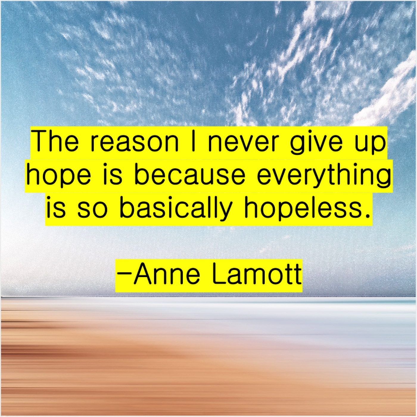 Anne Lamott Anne Lamott – The reason I never give… October 12, 2019 admin “The reason I never give up hope is because everything is so basically hopeless.”-Anne Lamott