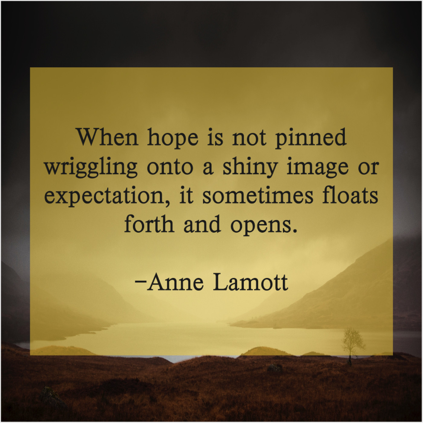 Anne Lamott Anne Lamott – When hope is not pinned… October 21, 2019 admin “When hope is not pinned wriggling onto a shiny image or expectation, it sometimes floats forth and opens.”-Anne Lamott
