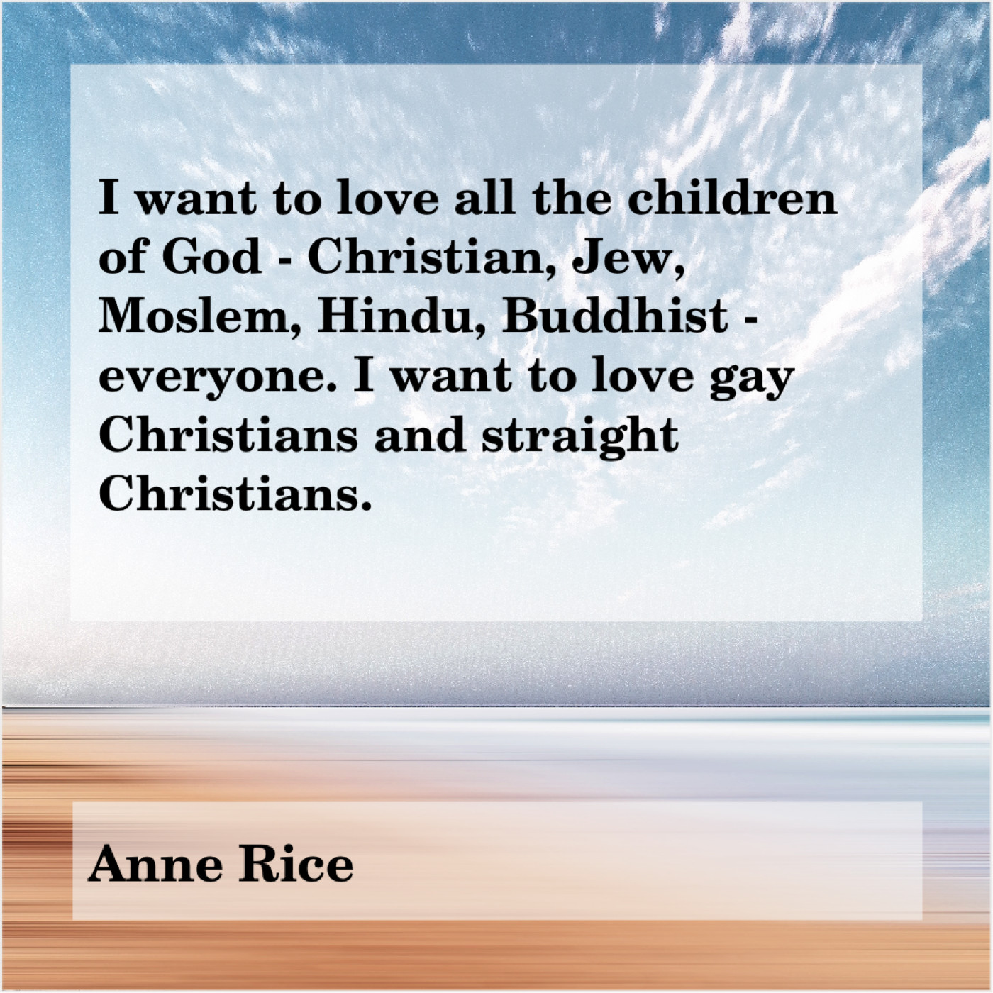Anne Rice Anne Rice – I want to love all… January 3, 2019 admin “I want to love all the children of God – Christian, Jew, Moslem, Hindu, Buddhist – everyone. I want to love gay Christians and straight Christians.”-Anne Rice