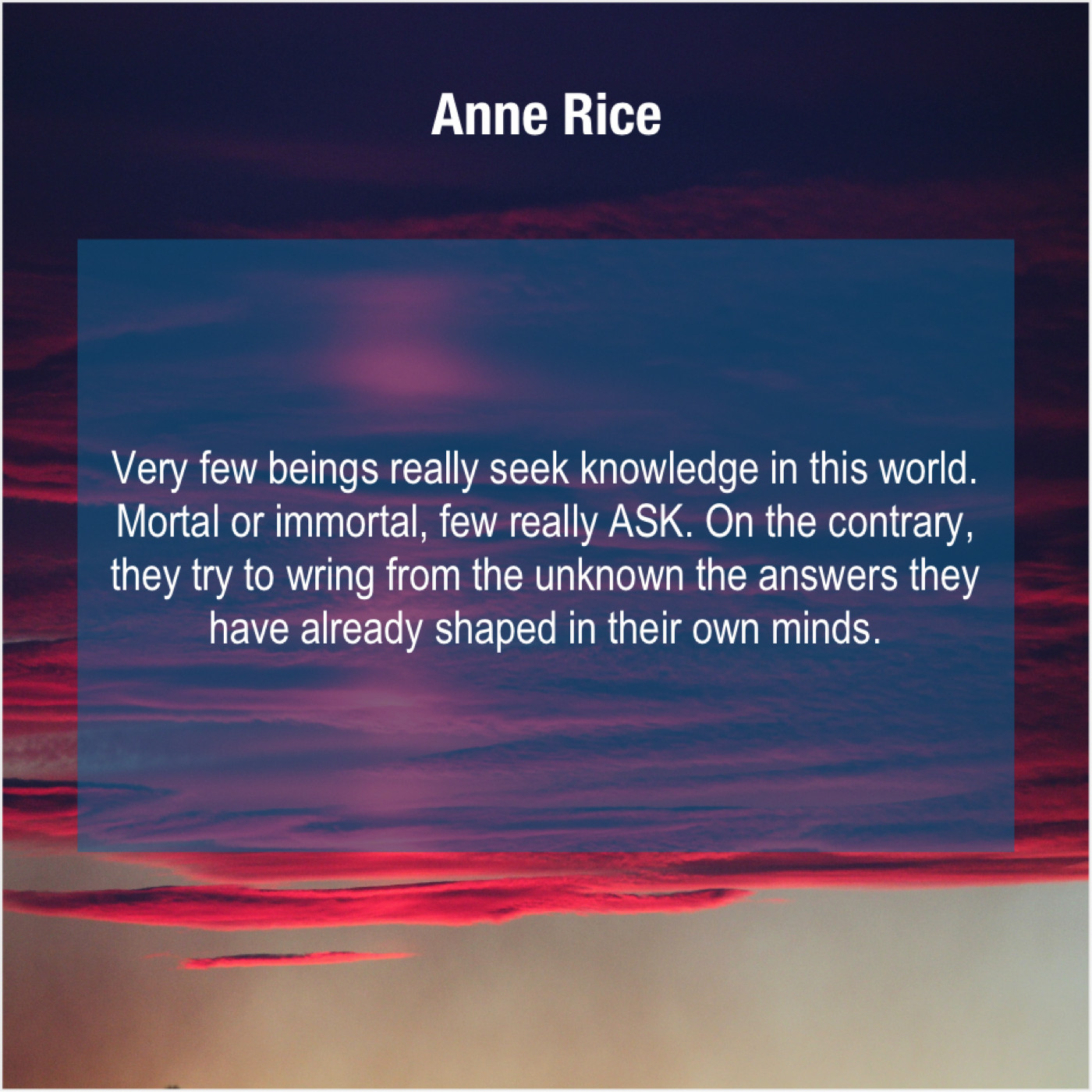 Anne Rice Anne Rice – Very few beings really seek… April 27, 2019 admin “Very few beings really seek knowledge in this world. Mortal or immortal, few really ASK. On the contrary, they try to wring from the unknown the answers they have already shaped in their own minds.”-Anne Rice