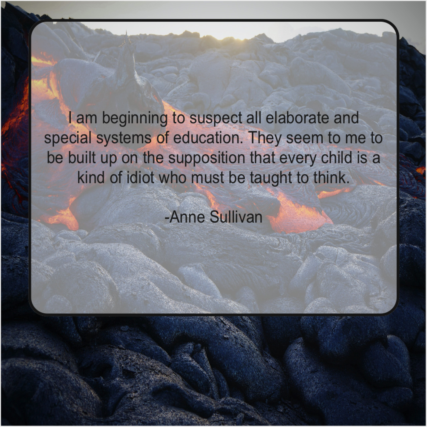 Anne Sullivan Anne Sullivan – I am beginning to suspect… October 18, 2019 admin “I am beginning to suspect all elaborate and special systems of education. They seem to me to be built up on the supposition that every child is a kind of idiot who must be taught to think.”-Anne Sullivan