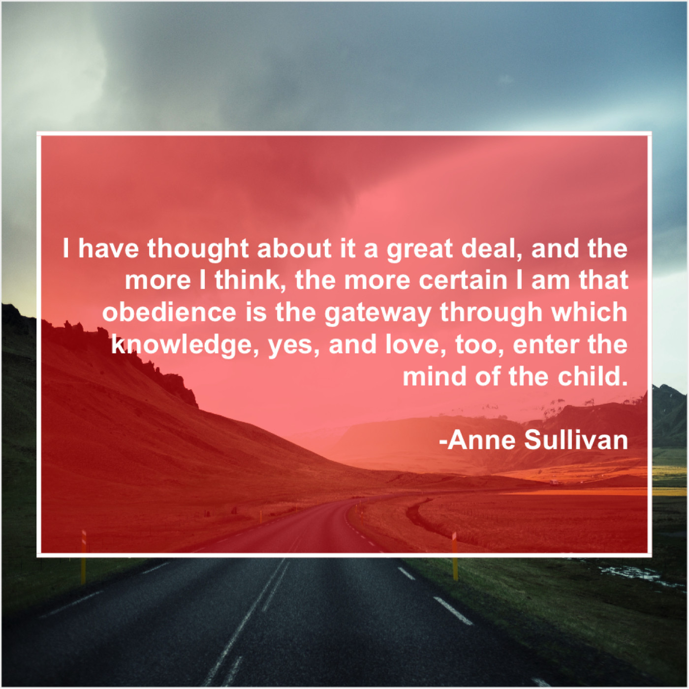 Anne Sullivan Anne Sullivan – I have thought about it… September 10, 2019 admin “I have thought about it a great deal, and the more I think, the more certain I am that obedience is the gateway through which knowledge, yes, and love, too, enter the mind of the child.”-Anne Sullivan