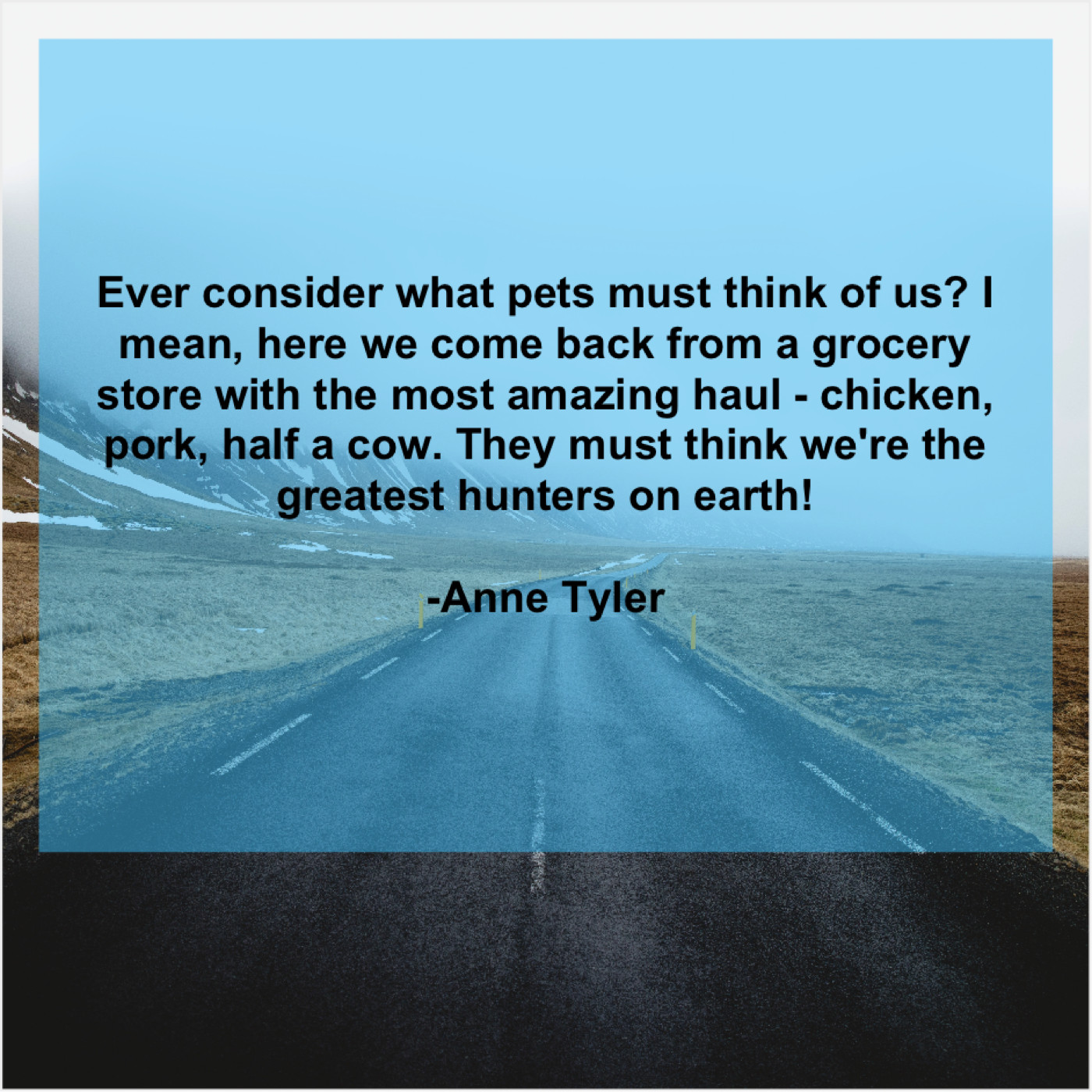Anne Tyler Anne Tyler – Ever consider what pets must… March 29, 2019 admin “Ever consider what pets must think of us? I mean, here we come back from a grocery store with the most amazing haul – chicken, pork, half a cow. They must think we’re the greatest hunters on earth!”-Anne Tyler