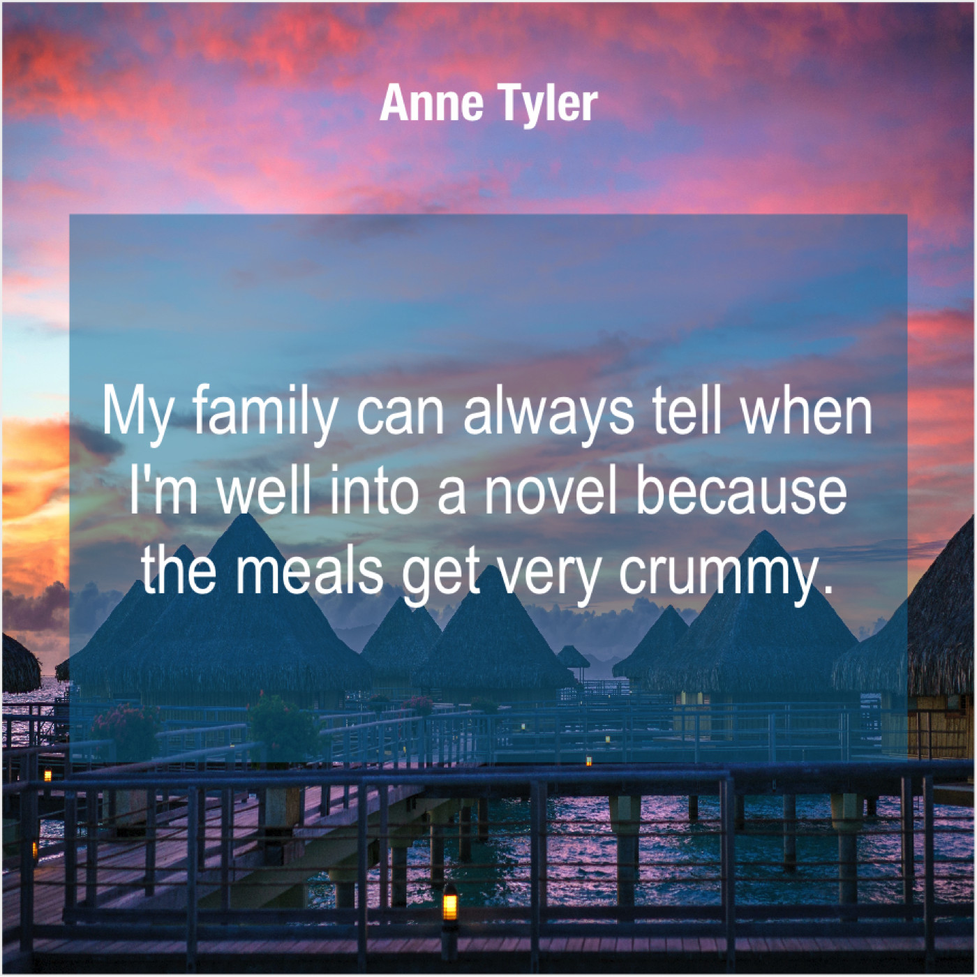 Anne Tyler Anne Tyler – My family can always tell… September 24, 2019 admin “My family can always tell when I’m well into a novel because the meals get very crummy.”-Anne Tyler