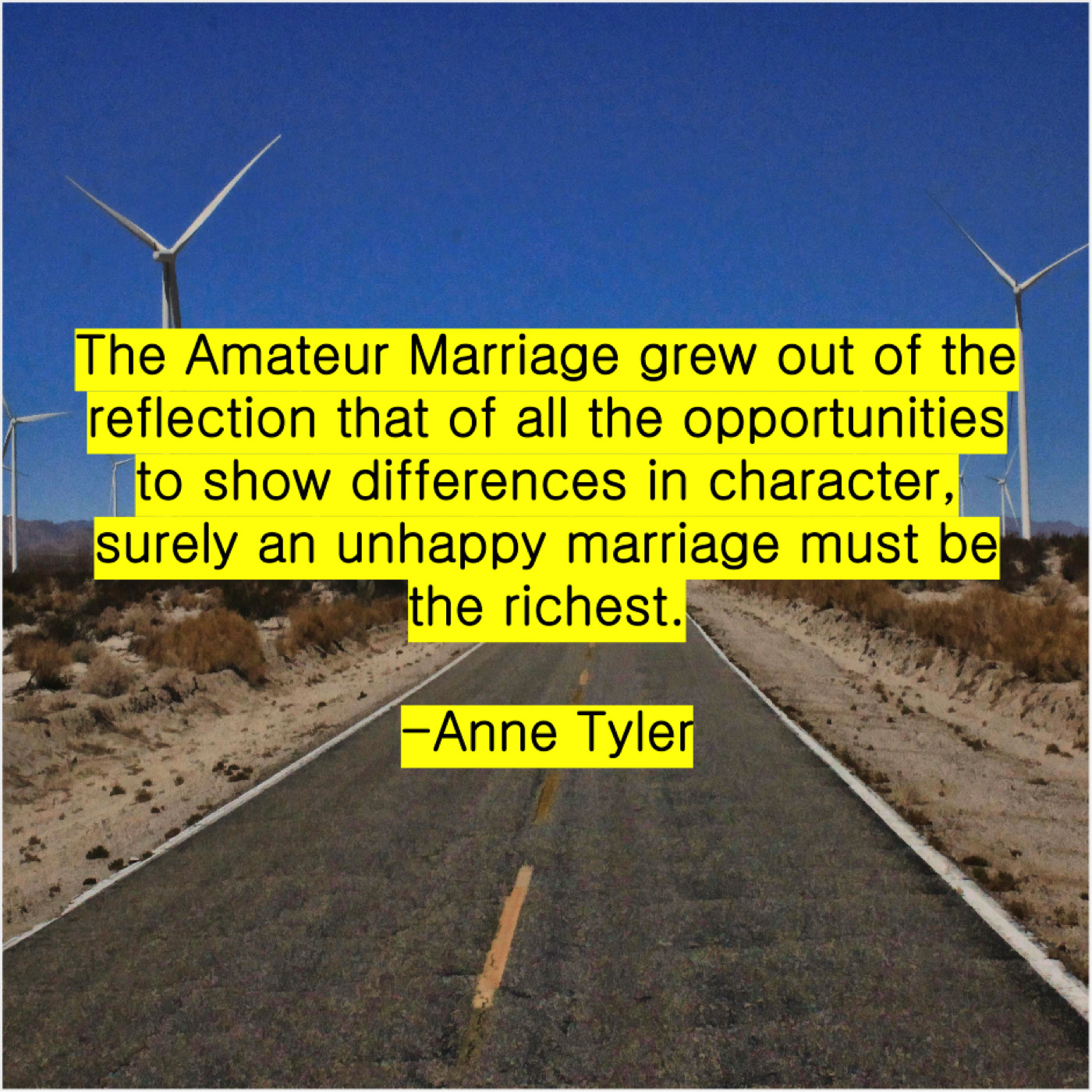 Anne Tyler Anne Tyler – The Amateur Marriage grew out… January 17, 2019 admin “The Amateur Marriage grew out of the reflection that of all the opportunities to show differences in character, surely an unhappy marriage must be the richest.”-Anne Tyler