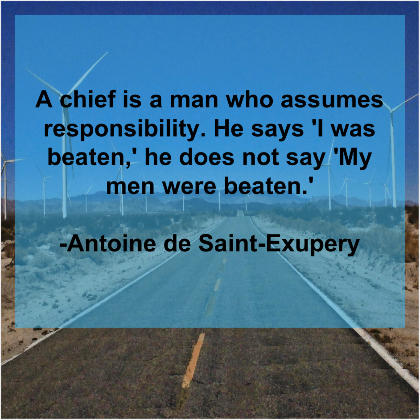 Antoine de Saint-Exupery Antoine de Saint-Exupery – A chief is a man… November 7, 2018 admin “A chief is a man who assumes responsibility. He says ‘I was beaten,’ he does not say ‘My men were beaten.'”-Antoine de Saint-Exupery