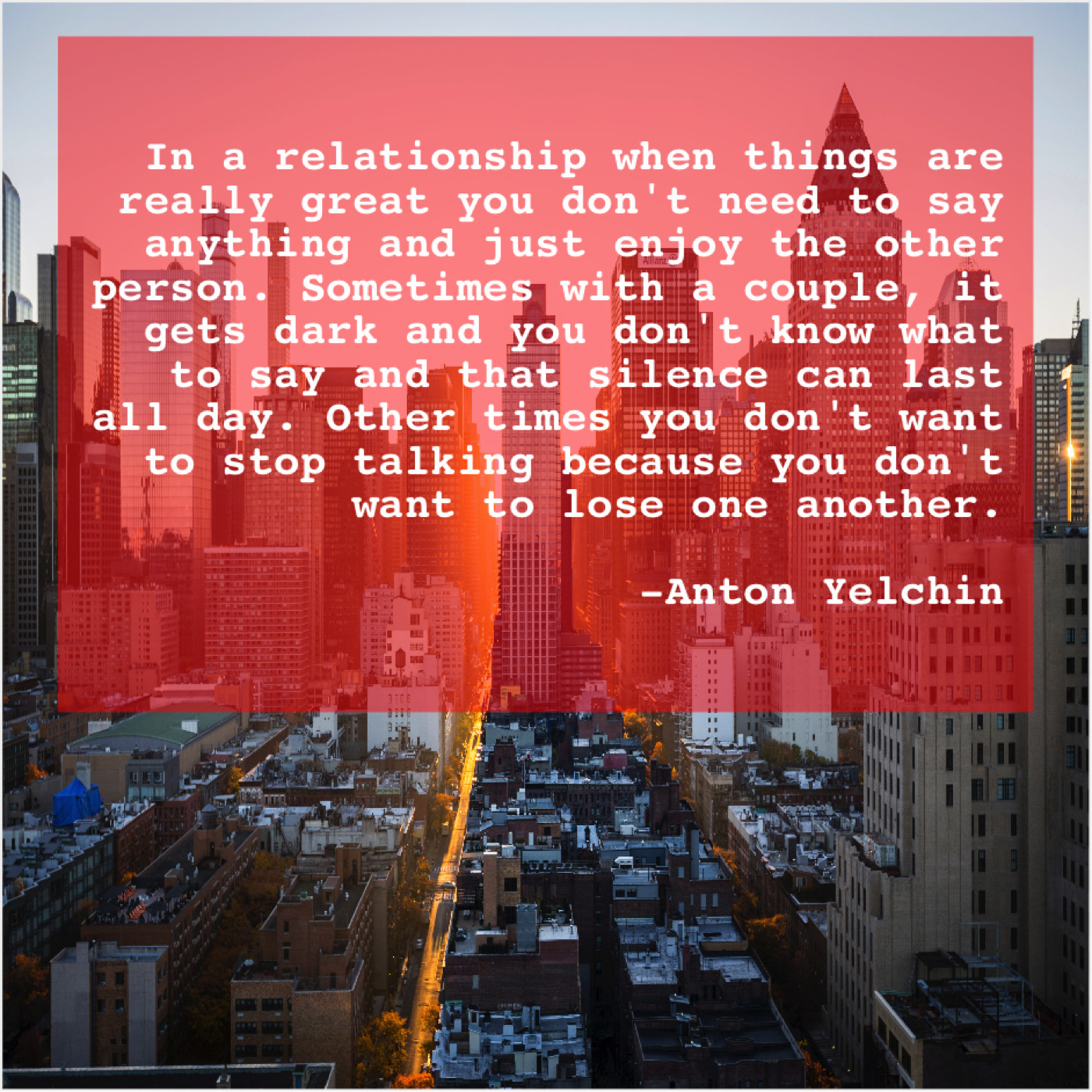 “In a relationship when things are really great you don’t need to say anything and just enjoy the other person. Sometimes with a couple, it gets dark and you don’t know what to say and that silence can last all day. Other times you don’t want to stop talking because you don’t want to lose one another.”
