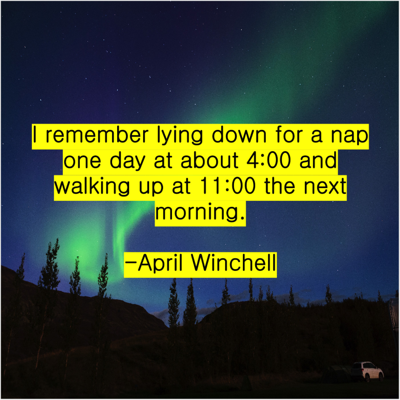 April Winchell April Winchell – I remember lying down for… September 9, 2019 admin “I remember lying down for a nap one day at about 4:00 and walking up at 11:00 the next morning.”-April Winchell