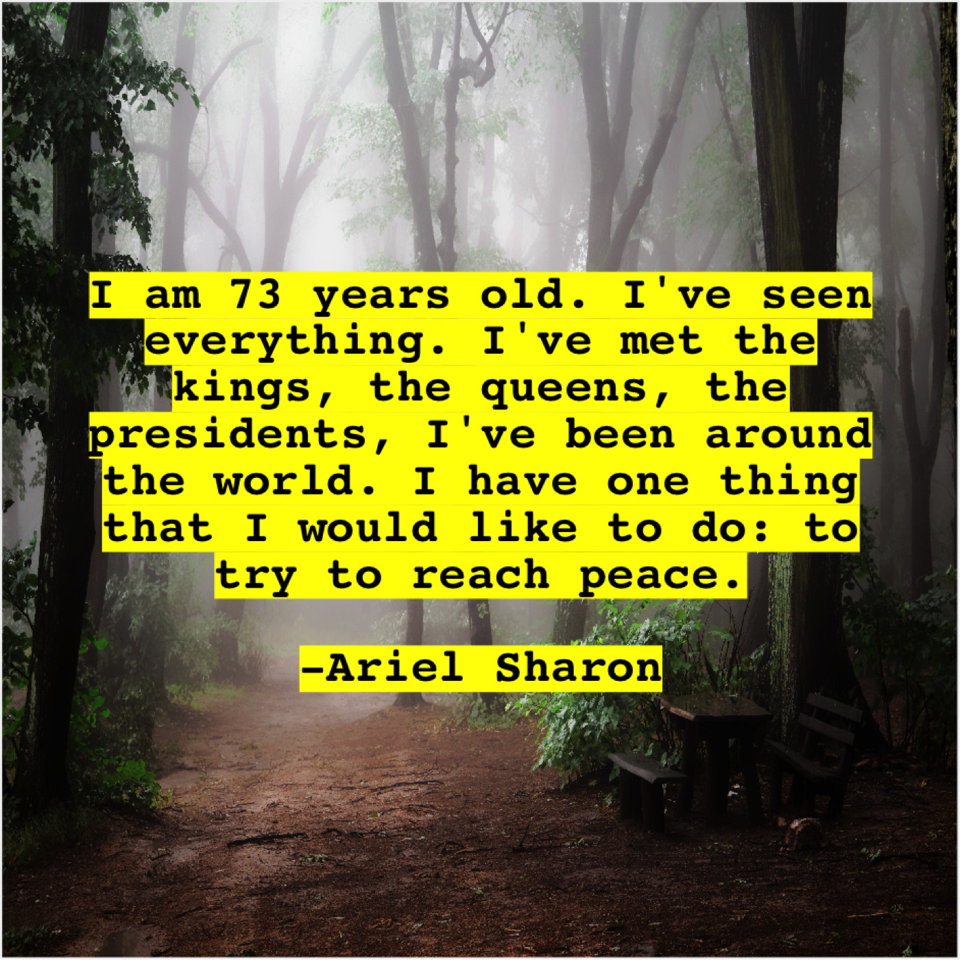 Ariel Sharon Ariel Sharon – I am 73 years old… May 11, 2019 admin “I am 73 years old. I’ve seen everything. I’ve met the kings, the queens, the presidents, I’ve been around the world. I have one thing that I would like to do: to try to reach peace.”-Ariel Sharon