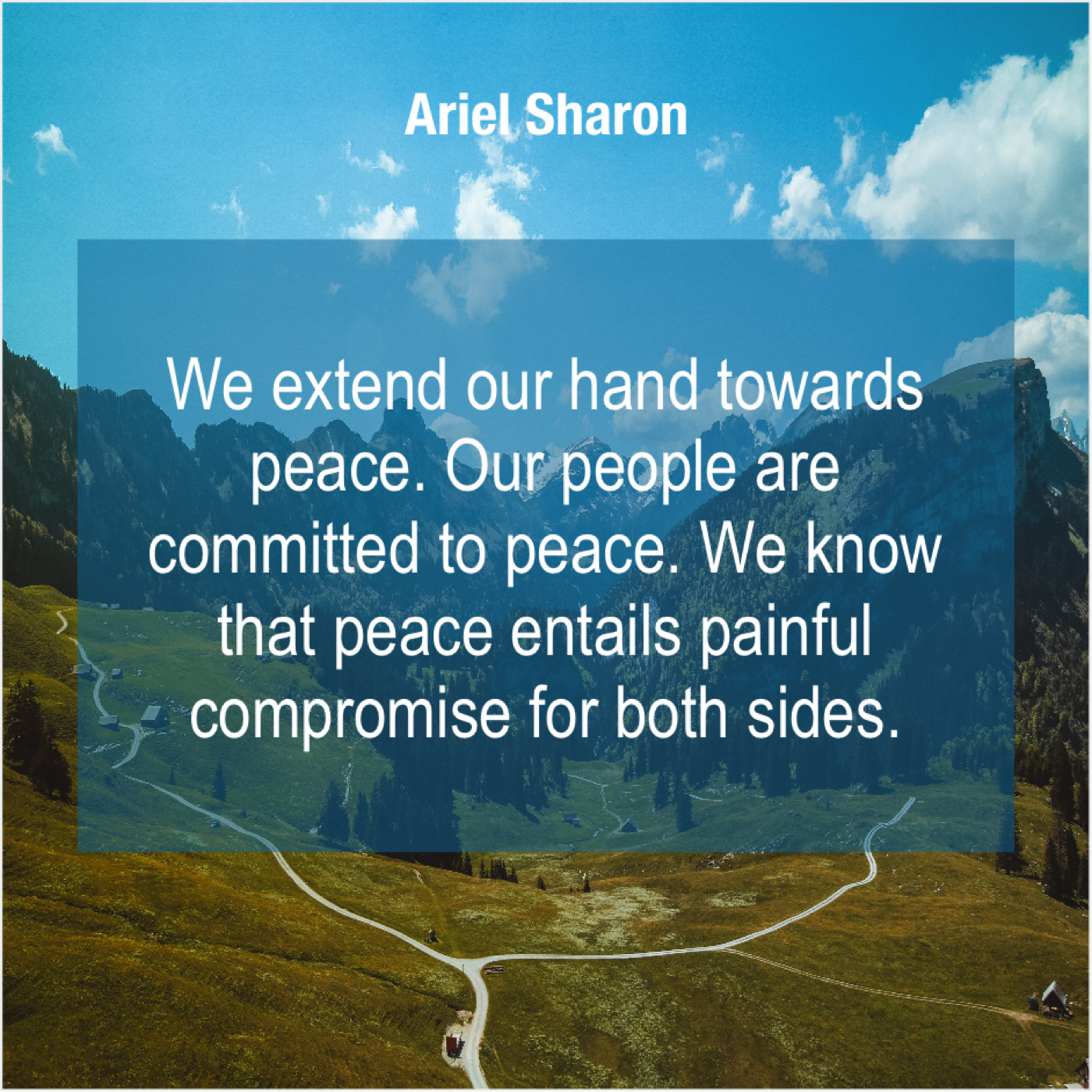 Ariel Sharon Ariel Sharon – We extend our hand towards… October 16, 2019 admin “We extend our hand towards peace. Our people are committed to peace. We know that peace entails painful compromise for both sides.”-Ariel Sharon