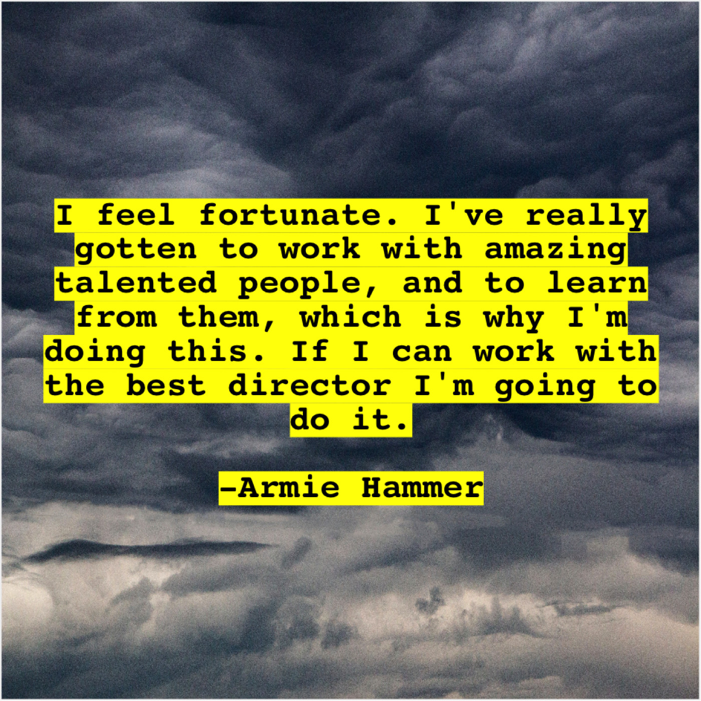Armie Hammer Armie Hammer – I feel fortunate. I’ve really… September 12, 2019 admin “I feel fortunate. I’ve really gotten to work with amazing talented people, and to learn from them, which is why I’m doing this. If I can work with the best director I’m going to do it.”-Armie Hammer