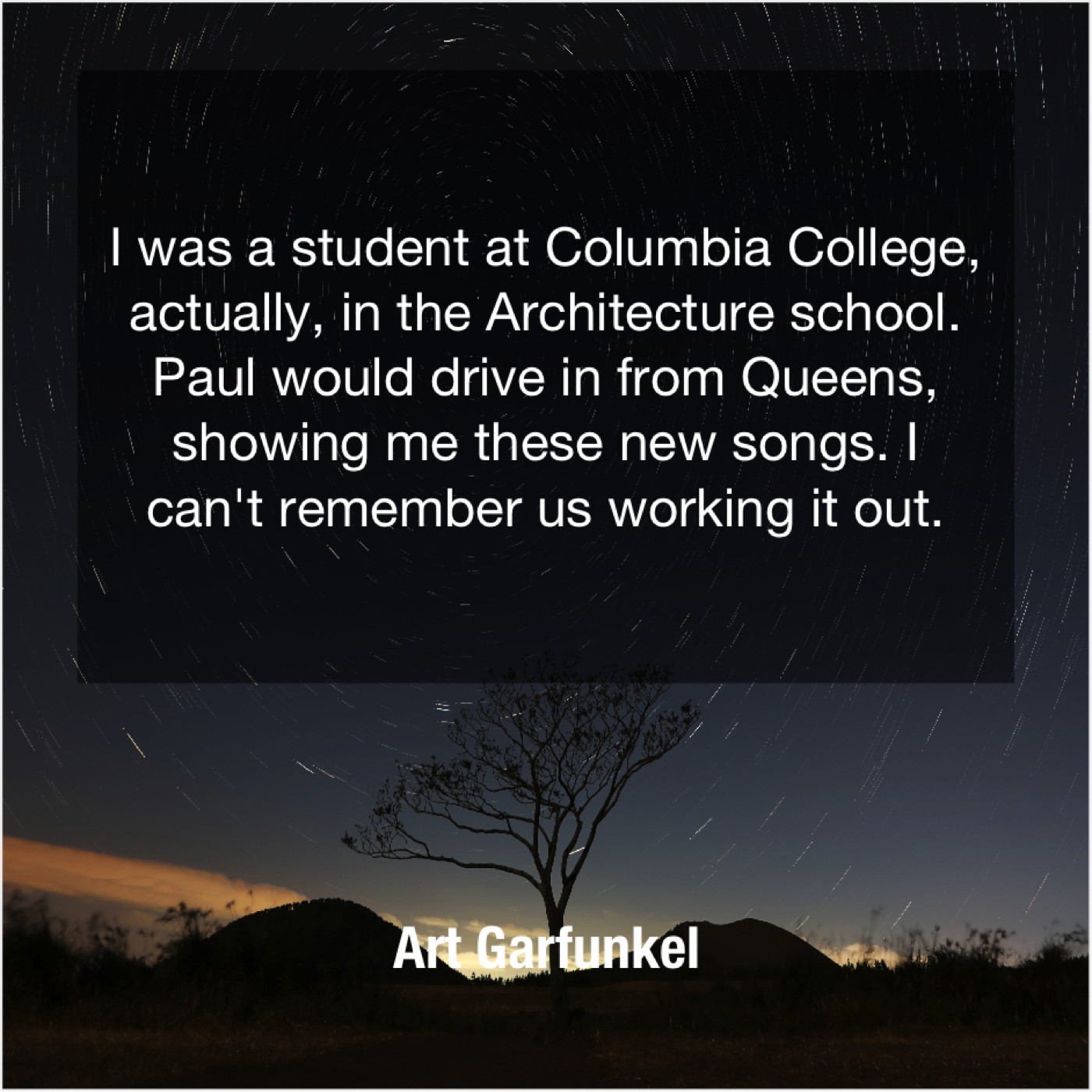 Art Garfunkel Art Garfunkel – I was a student at… June 22, 2019 admin “I was a student at Columbia College, actually, in the Architecture school. Paul would drive in from Queens, showing me these new songs. I can’t remember us working it out.”-Art Garfunkel