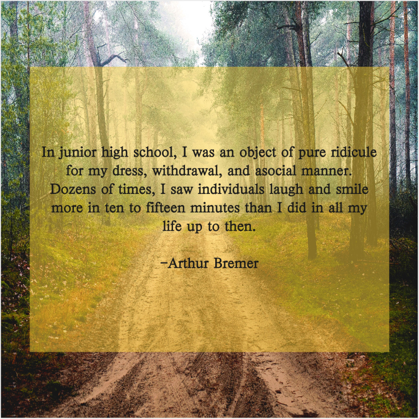 Arthur Bremer Arthur Bremer – In junior high school, I… June 8, 2019 admin “In junior high school, I was an object of pure ridicule for my dress, withdrawal, and asocial manner. Dozens of times, I saw individuals laugh and smile more in ten to fifteen minutes than I did in all my life up to then.”-Arthur Bremer