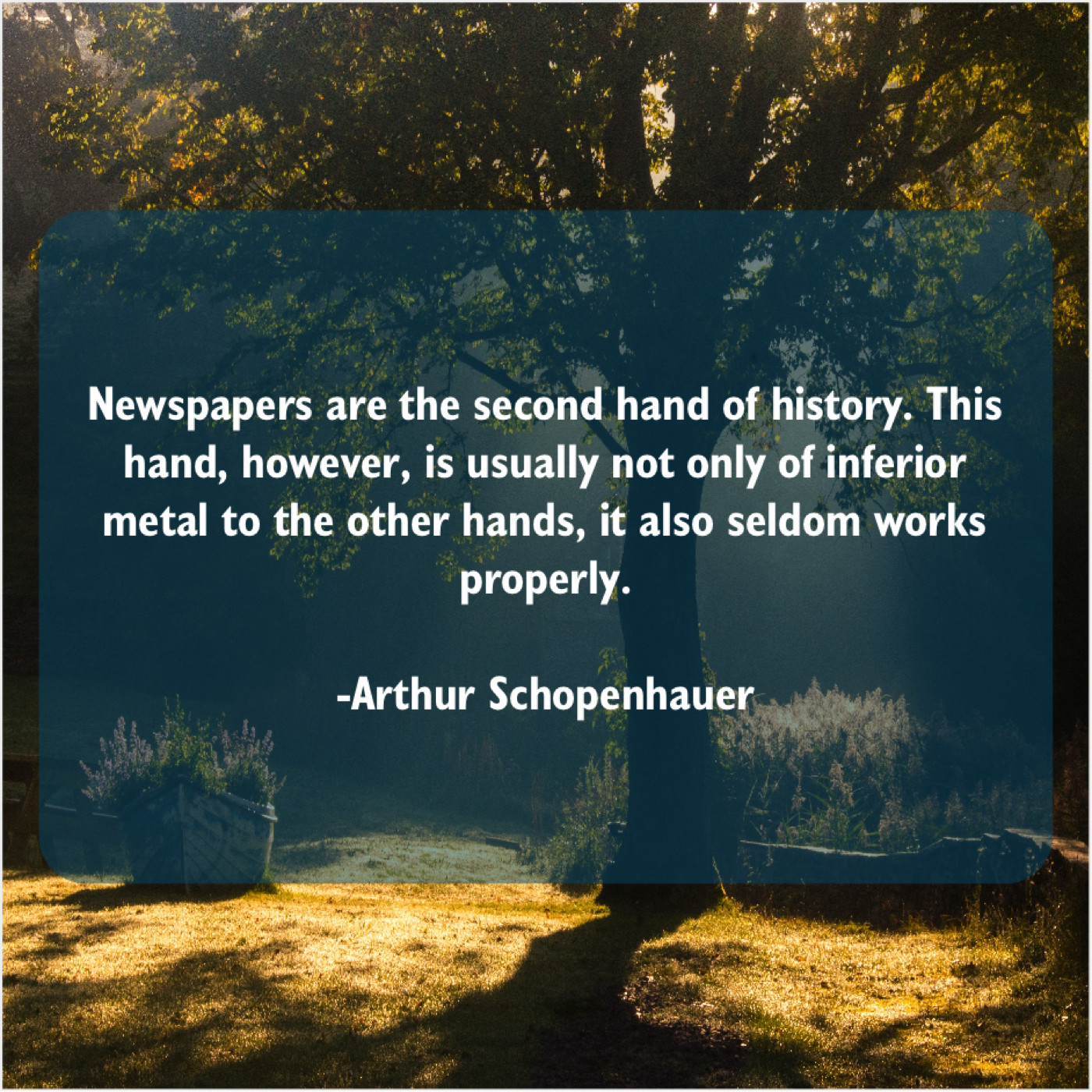 Arthur Schopenhauer Arthur Schopenhauer – Newspapers are the second hand… March 13, 2019 admin “Newspapers are the second hand of history. This hand, however, is usually not only of inferior metal to the other hands, it also seldom works properly.”-Arthur Schopenhauer