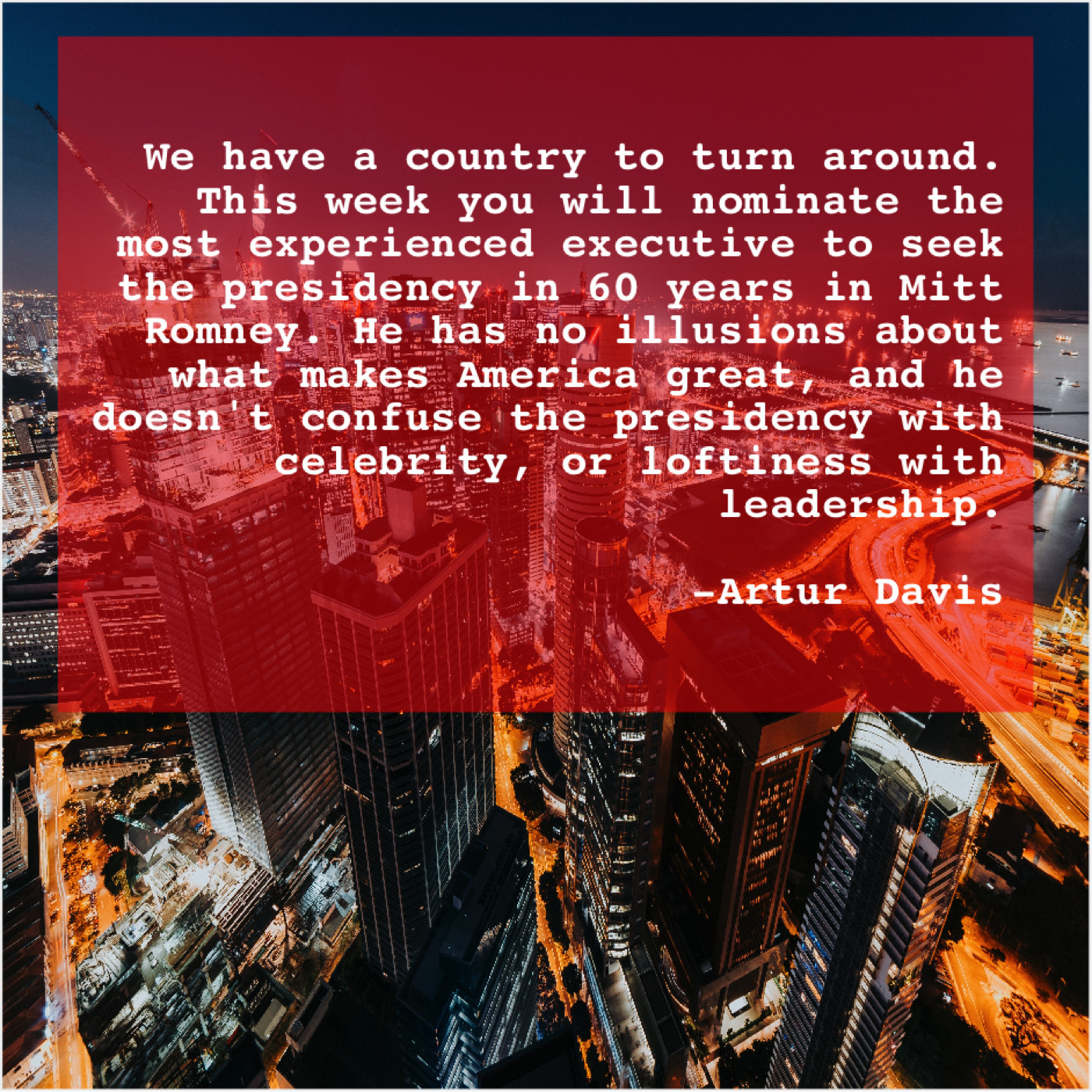 “We have a country to turn around. This week you will nominate the most experienced executive to seek the presidency in 60 years in Mitt Romney. He has no illusions about what makes America great, and he doesn’t confuse the presidency with celebrity, or loftiness with leadership.”