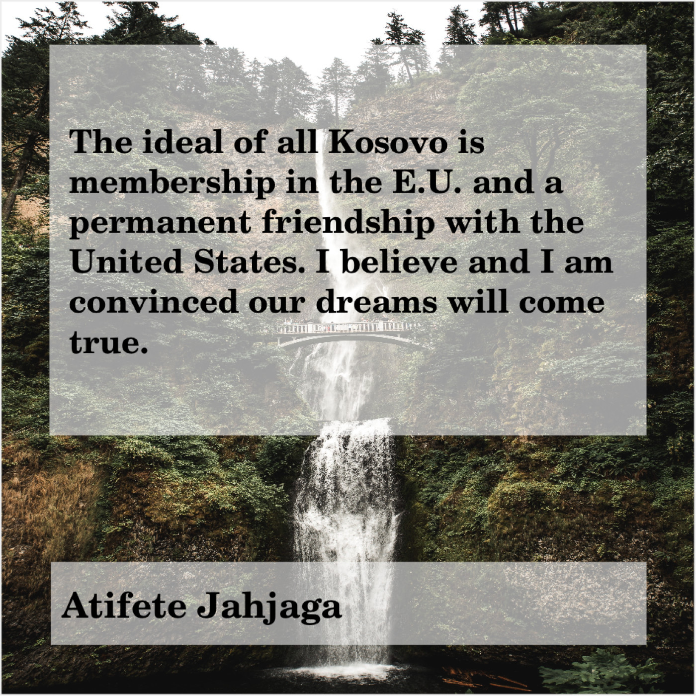 Atifete Jahjaga Atifete Jahjaga – The ideal of all Kosovo… October 4, 2019 admin “The ideal of all Kosovo is membership in the E.U. and a permanent friendship with the United States. I believe and I am convinced our dreams will come true.”-Atifete Jahjaga