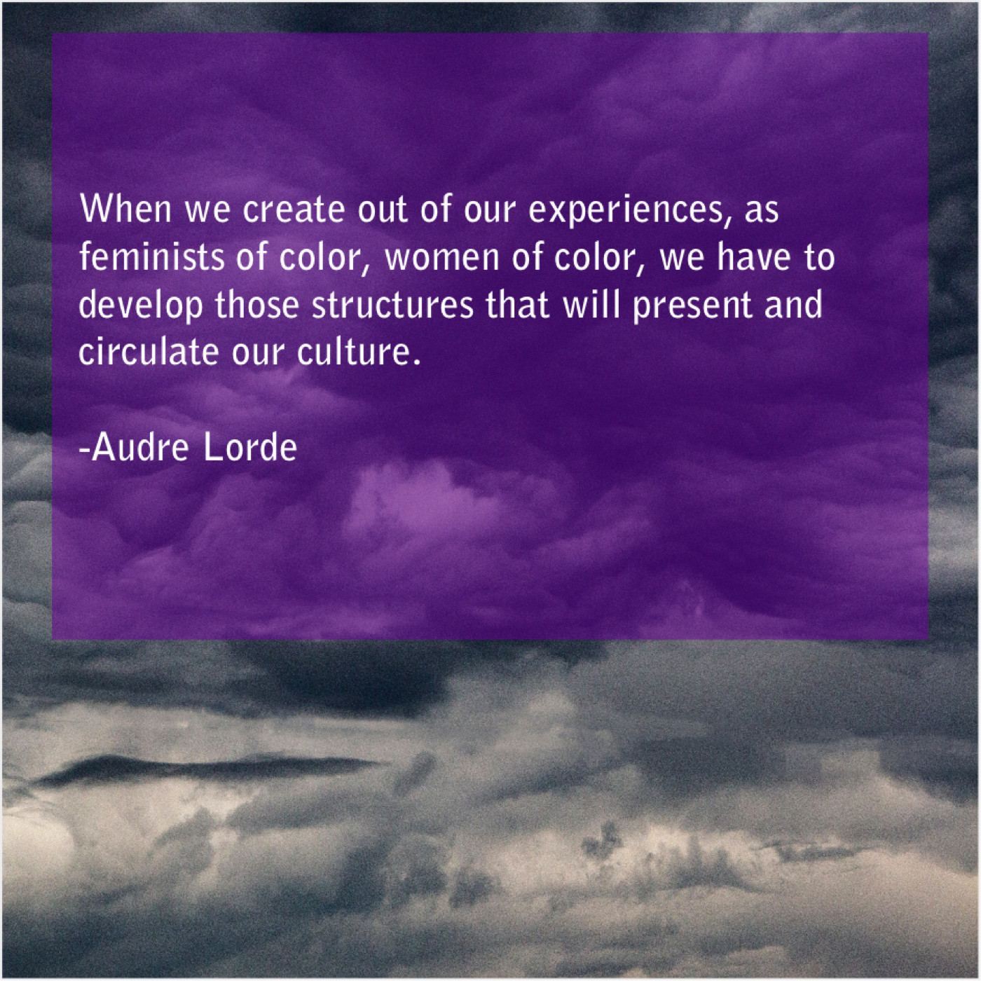 Audre Lorde Audre Lorde – When we create out of… September 11, 2019 admin “When we create out of our experiences, as feminists of color, women of color, we have to develop those structures that will present and circulate our culture.”-Audre Lorde