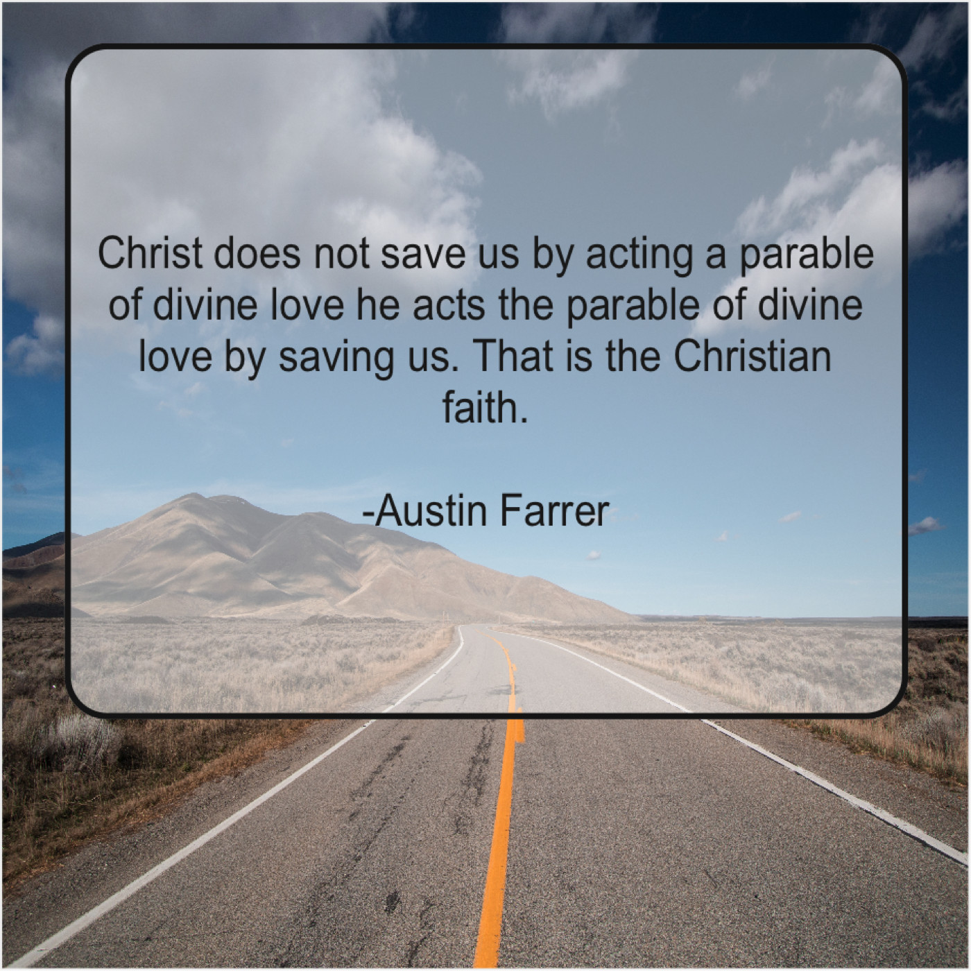 Austin Farrer Austin Farrer – Christ does not save us… August 3, 2019 admin “Christ does not save us by acting a parable of divine love he acts the parable of divine love by saving us. That is the Christian faith.”-Austin Farrer
