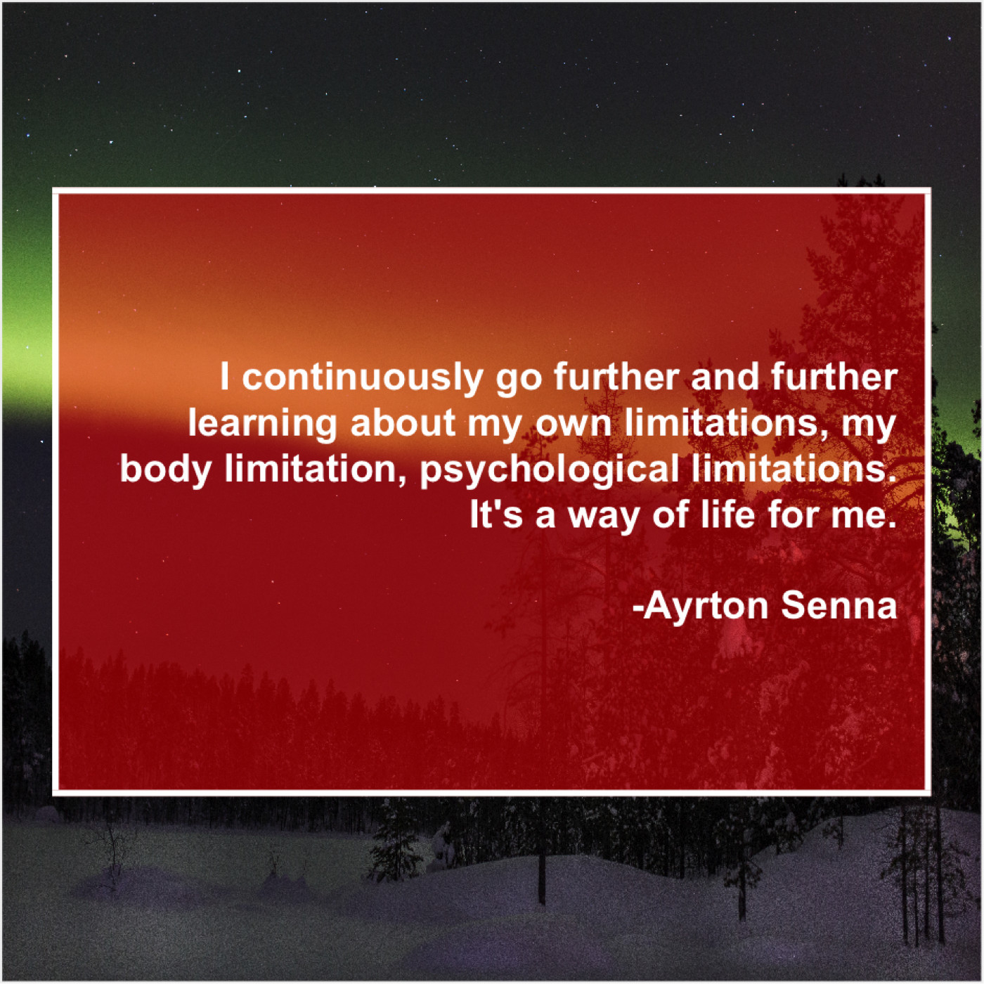 Ayrton Senna Ayrton Senna – I continuously go further and… June 14, 2019 admin “I continuously go further and further learning about my own limitations, my body limitation, psychological limitations. It’s a way of life for me.”-Ayrton Senna