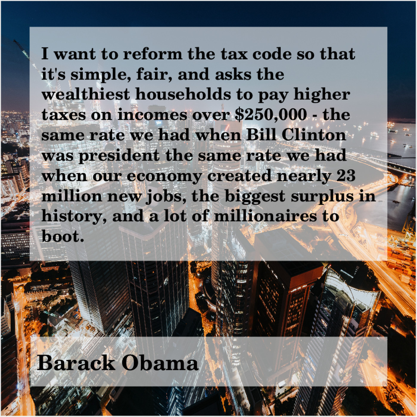 “I want to reform the tax code so that it’s simple, fair, and asks the wealthiest households to pay higher taxes on incomes over $250,000 – the same rate we had when Bill Clinton was president the same rate we had when our economy created nearly 23 million new jobs, the biggest surplus in history, and a lot of millionaires to boot.”