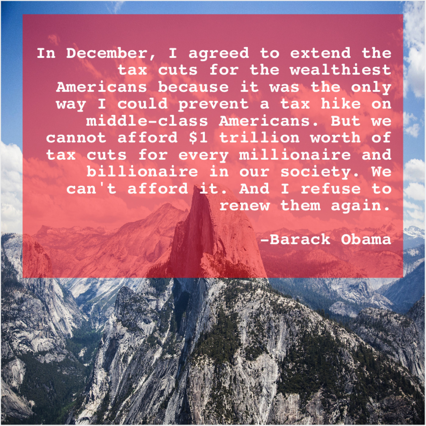 “In December, I agreed to extend the tax cuts for the wealthiest Americans because it was the only way I could prevent a tax hike on middle-class Americans. But we cannot afford $1 trillion worth of tax cuts for every millionaire and billionaire in our society. We can’t afford it. And I refuse to renew them again.”