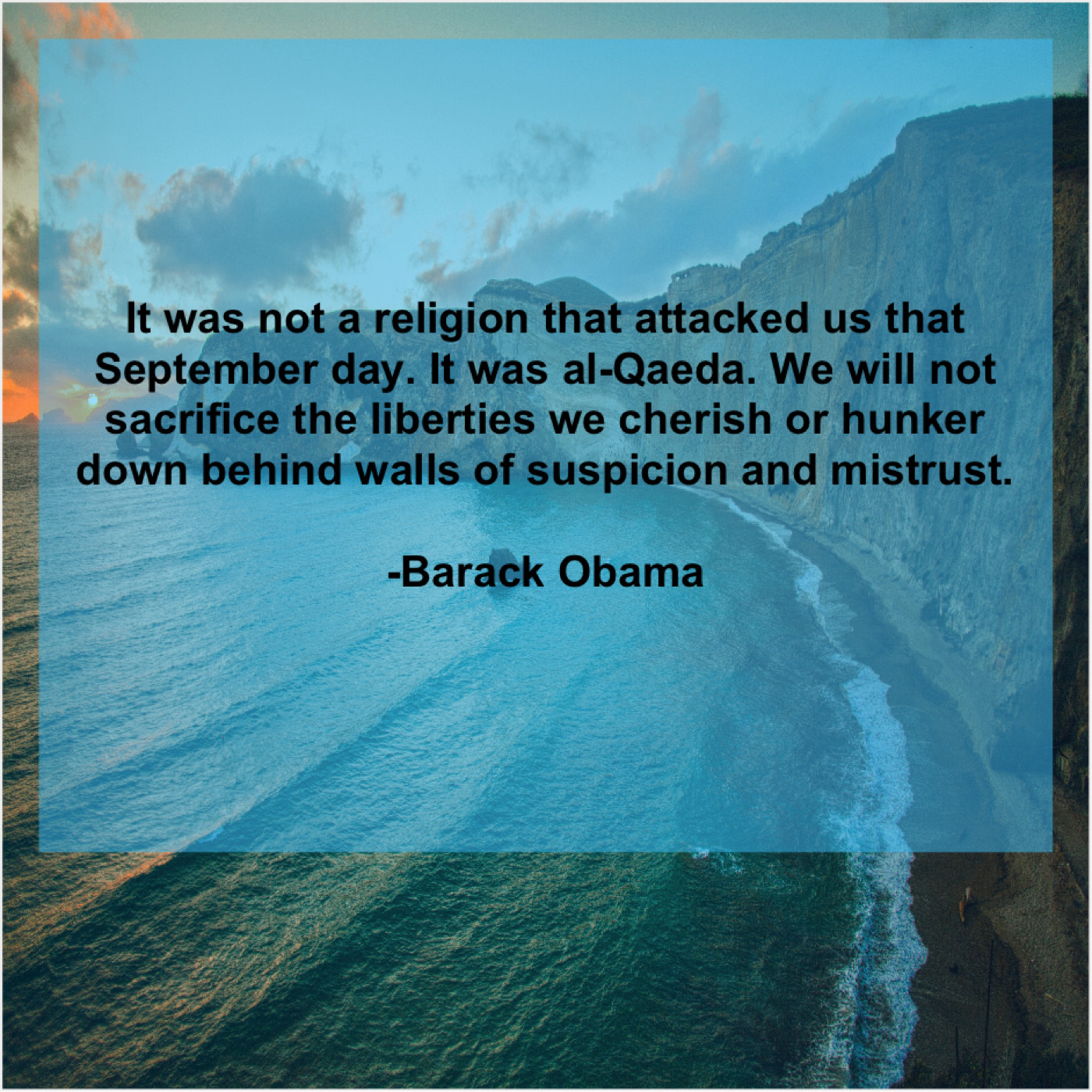 Barack Obama Barack Obama – It was not a religion… October 22, 2019 admin “It was not a religion that attacked us that September day. It was al-Qaeda. We will not sacrifice the liberties we cherish or hunker down behind walls of suspicion and mistrust.”-Barack Obama