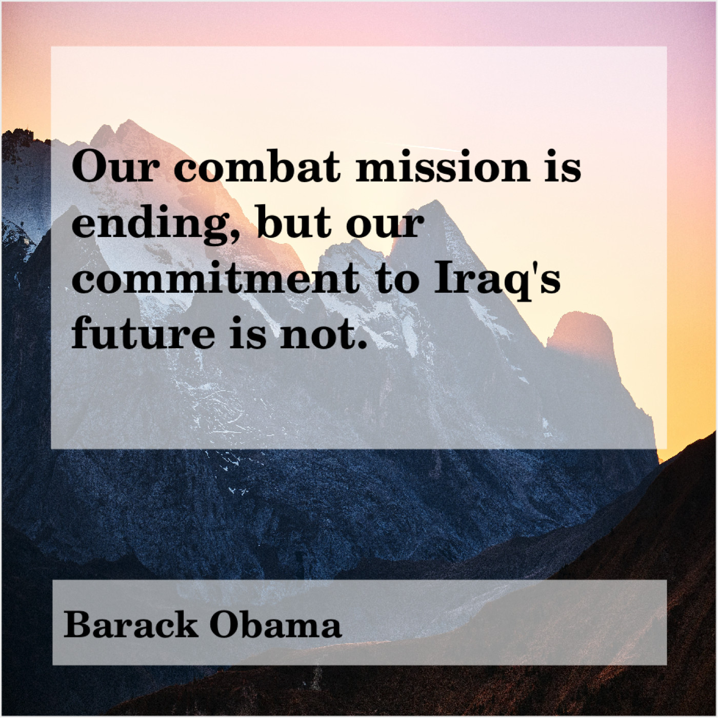 Barack Obama Barack Obama – Our combat mission is ending… December 13, 2018 admin “Our combat mission is ending, but our commitment to Iraq’s future is not.”-Barack Obama