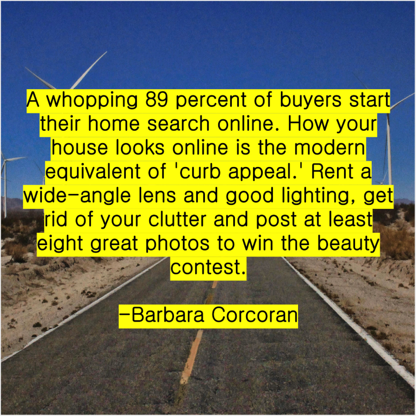 “A whopping 89 percent of buyers start their home search online. How your house looks online is the modern equivalent of ‘curb appeal.’ Rent a wide-angle lens and good lighting, get rid of your clutter and post at least eight great photos to win the beauty contest.”