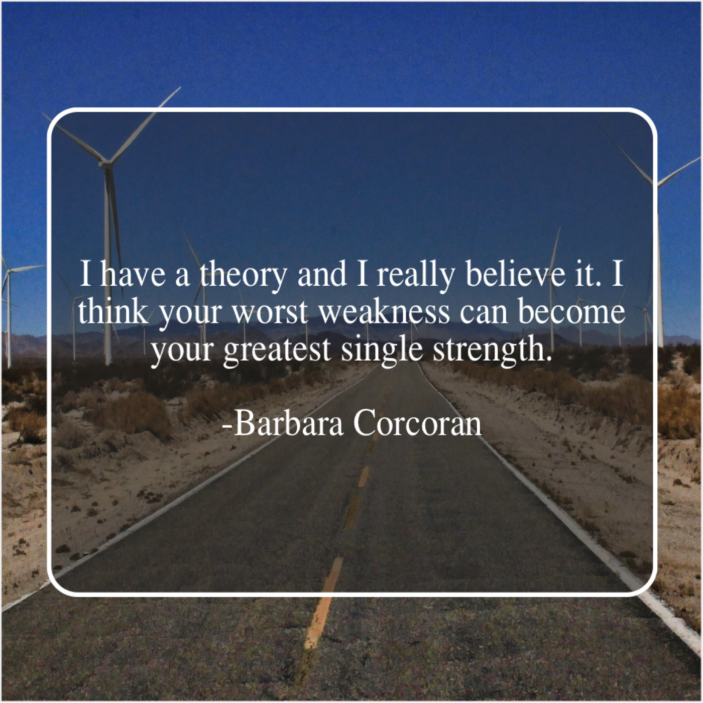 Barbara Corcoran Barbara Corcoran – I have a theory and… July 20, 2019 admin “I have a theory and I really believe it. I think your worst weakness can become your greatest single strength.”-Barbara Corcoran