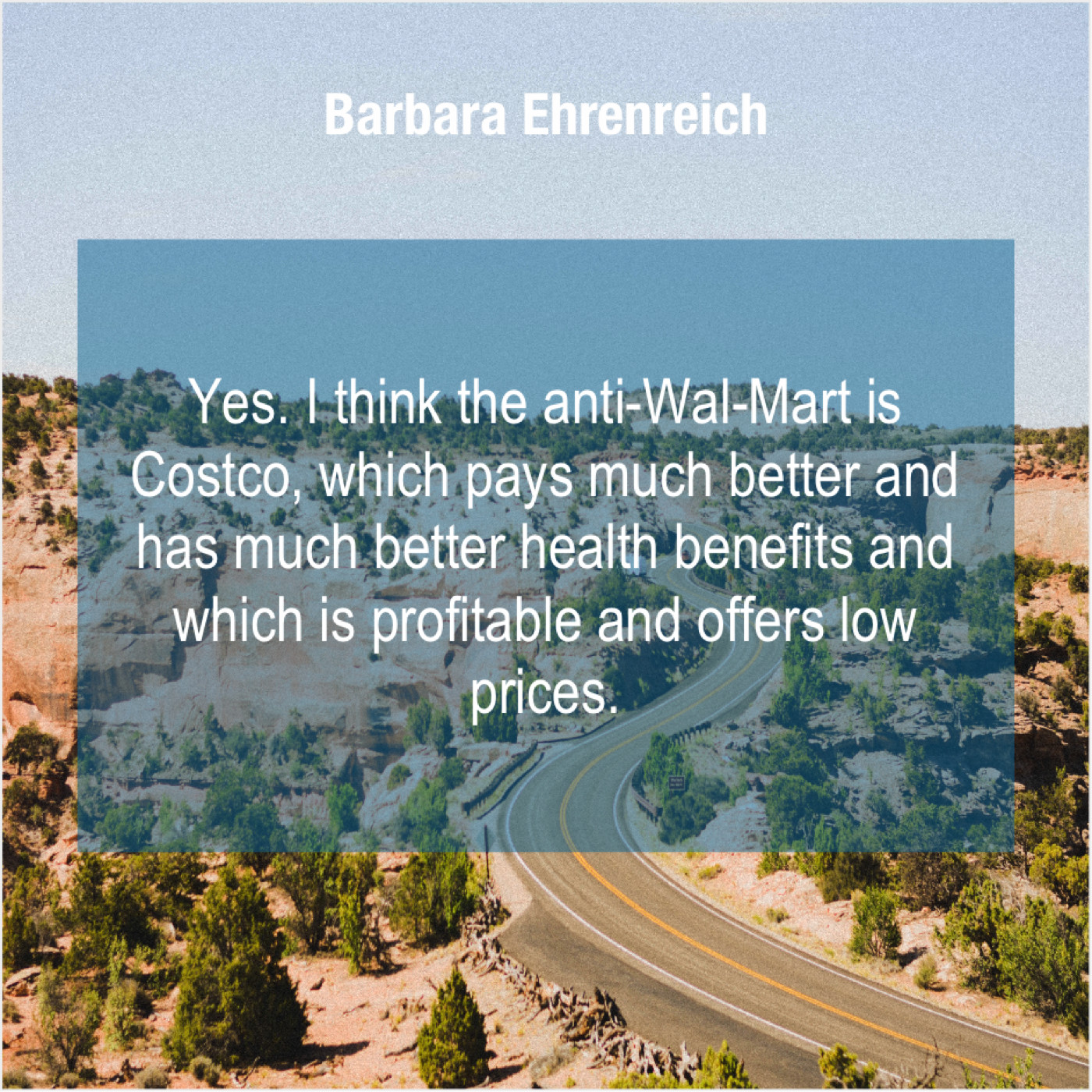 Barbara Ehrenreich Barbara Ehrenreich – Yes. I think the anti… December 29, 2018 admin “Yes. I think the anti-Wal-Mart is Costco, which pays much better and has much better health benefits and which is profitable and offers low prices.”-Barbara Ehrenreich