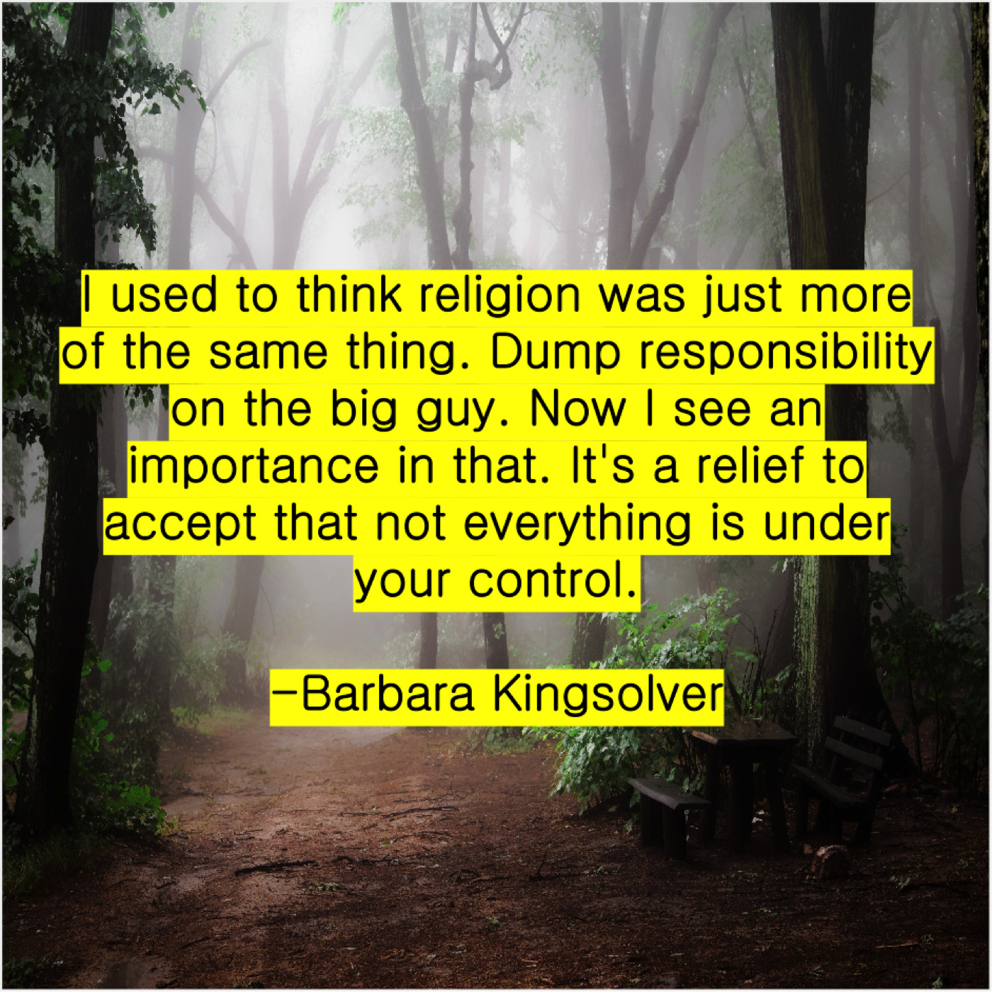 Barbara Kingsolver Barbara Kingsolver – I used to think religion… January 19, 2019 admin “I used to think religion was just more of the same thing. Dump responsibility on the big guy. Now I see an importance in that. It’s a relief to accept that not everything is under your control.”-Barbara Kingsolver