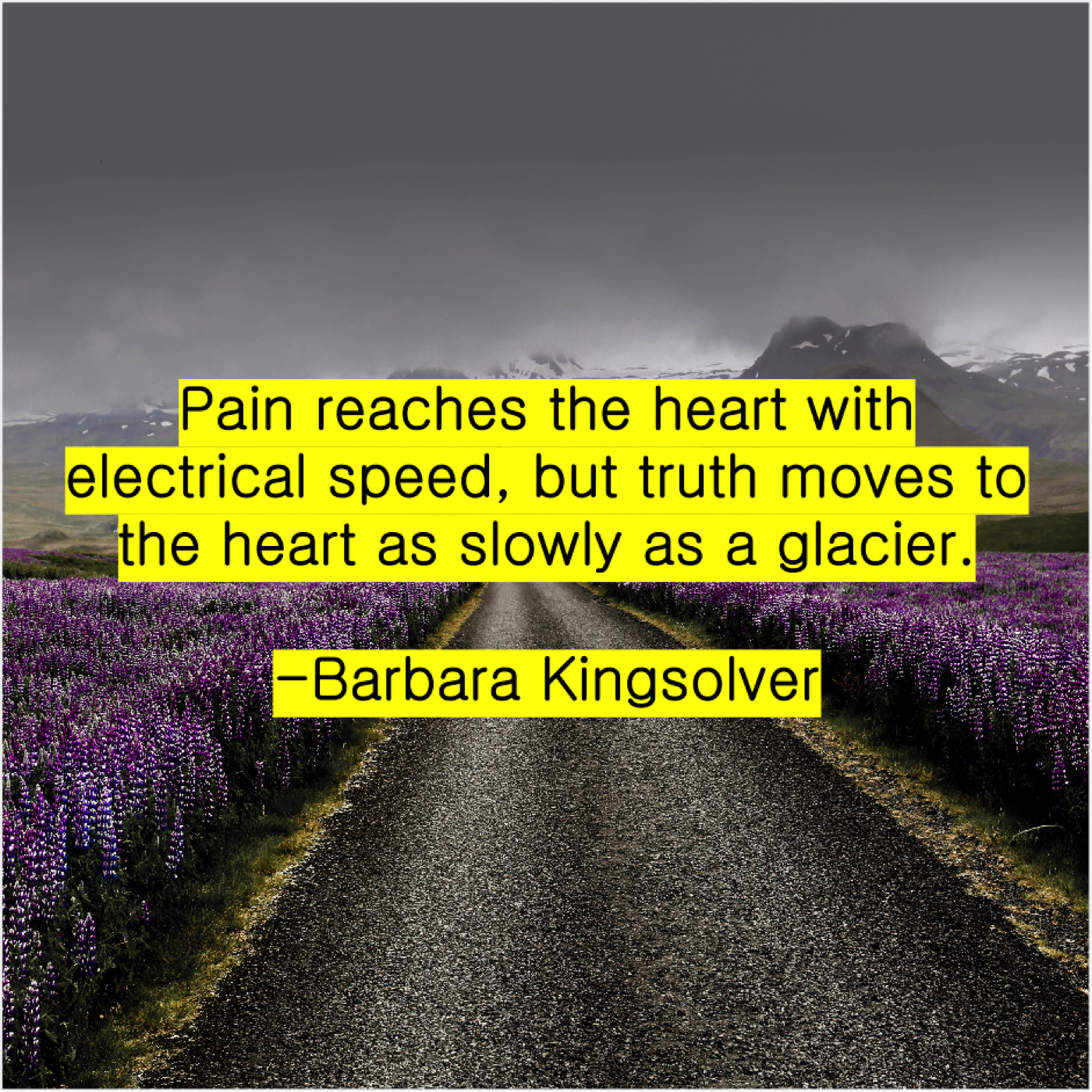 Barbara Kingsolver Barbara Kingsolver – Pain reaches the heart with… August 8, 2019 admin “Pain reaches the heart with electrical speed, but truth moves to the heart as slowly as a glacier.”-Barbara Kingsolver