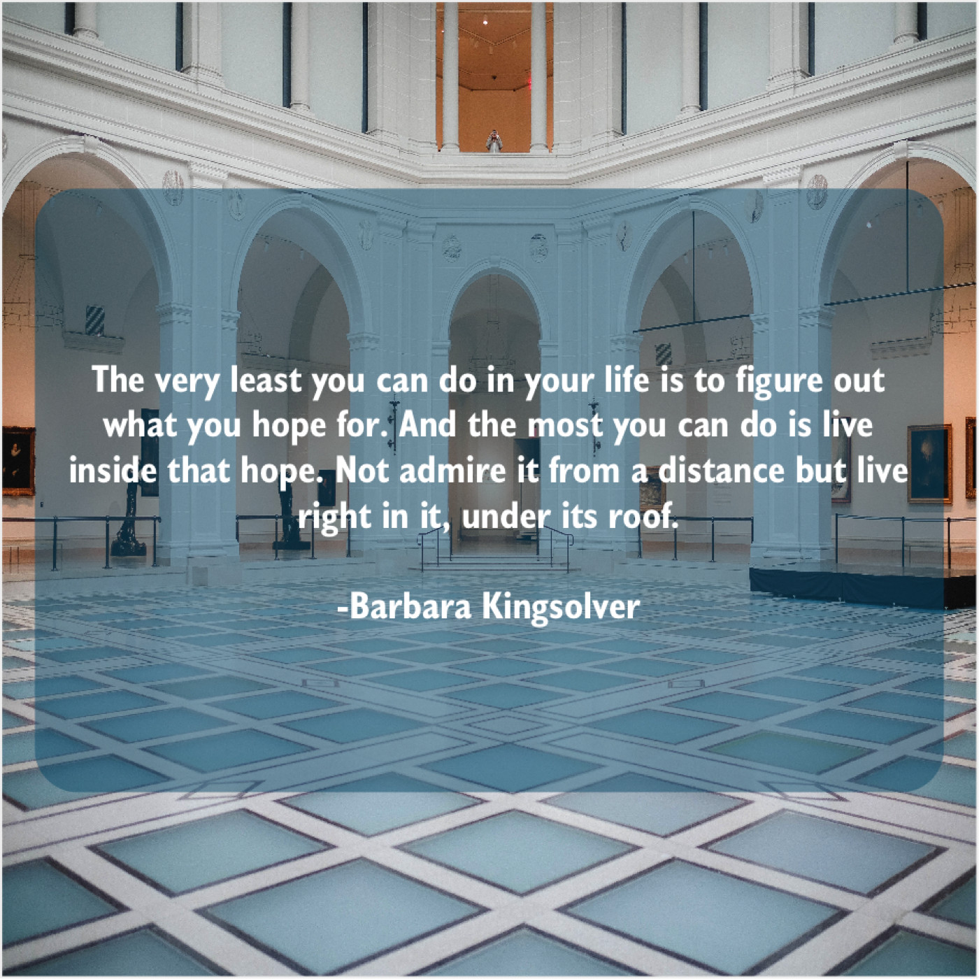 Barbara Kingsolver Barbara Kingsolver – The very least you can… December 5, 2018 admin “The very least you can do in your life is to figure out what you hope for. And the most you can do is live inside that hope. Not admire it from a distance but live right in it, under its roof.”-Barbara Kingsolver