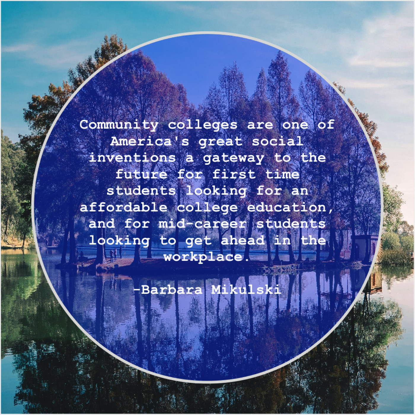 Barbara Mikulski Barbara Mikulski – Community colleges are one of… March 31, 2019 admin “Community colleges are one of America’s great social inventions a gateway to the future for first time students looking for an affordable college education, and for mid-career students looking to get ahead in the workplace.”-Barbara Mikulski
