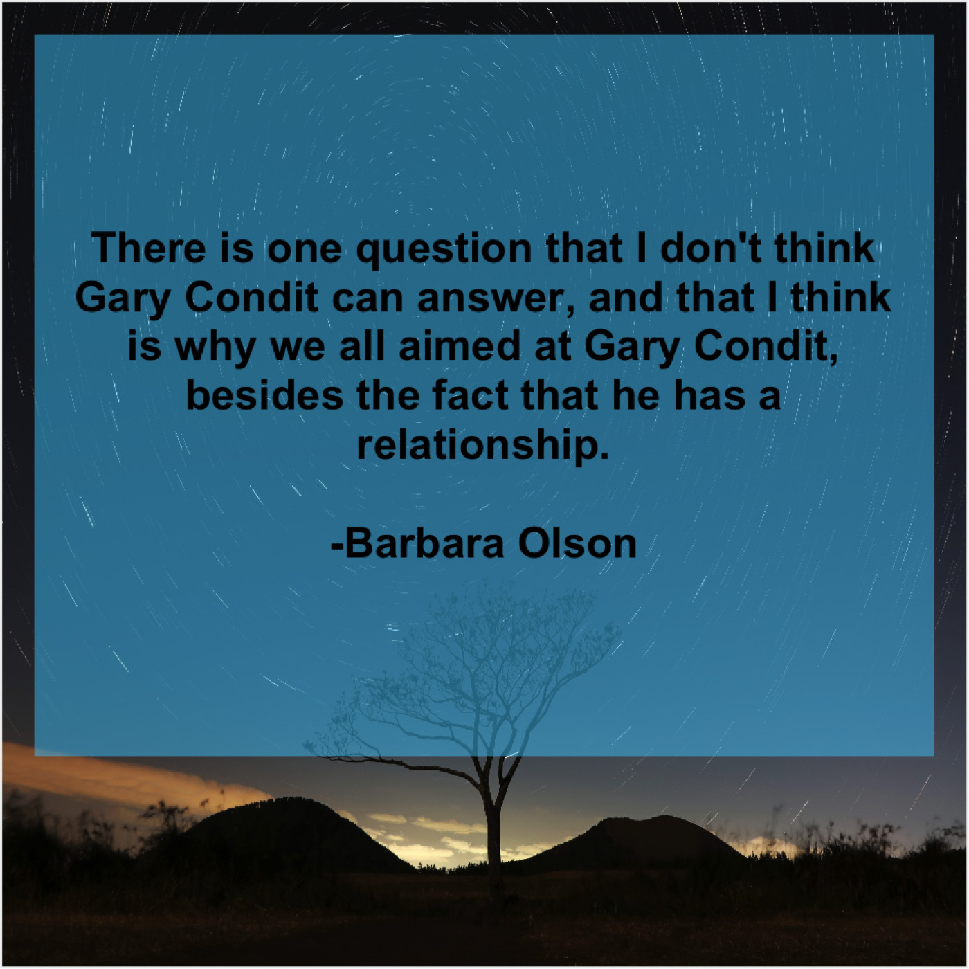 Barbara Olson Barbara Olson – There is one question that… November 23, 2018 admin “There is one question that I don’t think Gary Condit can answer, and that I think is why we all aimed at Gary Condit, besides the fact that he has a relationship.”-Barbara Olson