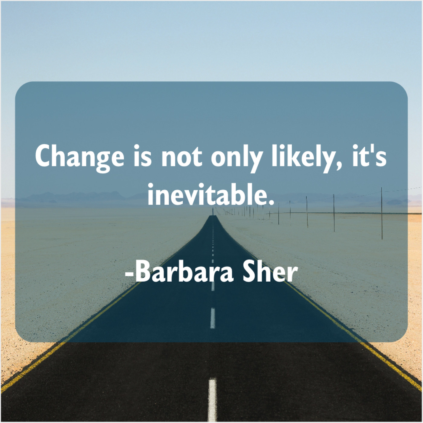 Barbara Sher Barbara Sher – Change is not only likely… January 3, 2019 admin “Change is not only likely, it’s inevitable.”-Barbara Sher