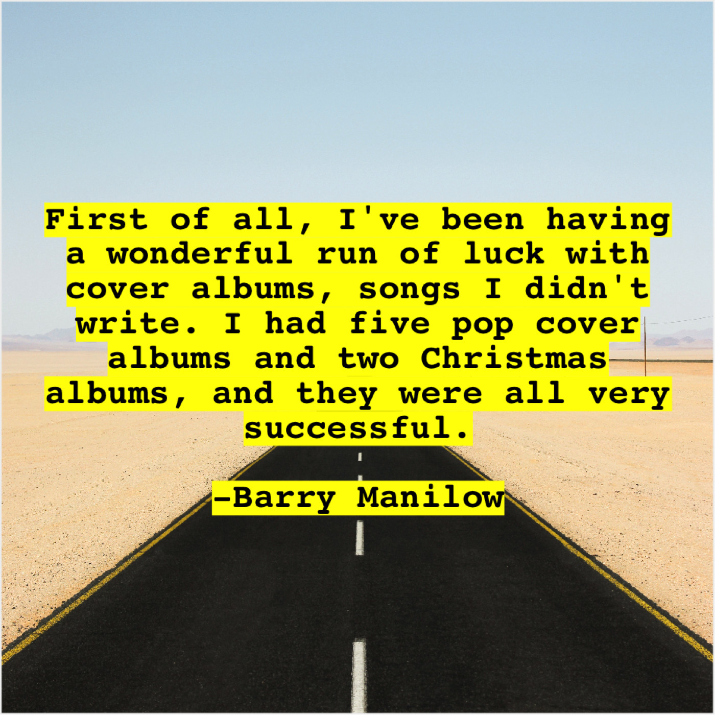 Barry Manilow Barry Manilow – First of all, I’ve been… February 11, 2019 admin “First of all, I’ve been having a wonderful run of luck with cover albums, songs I didn’t write. I had five pop cover albums and two Christmas albums, and they were all very successful.”-Barry Manilow